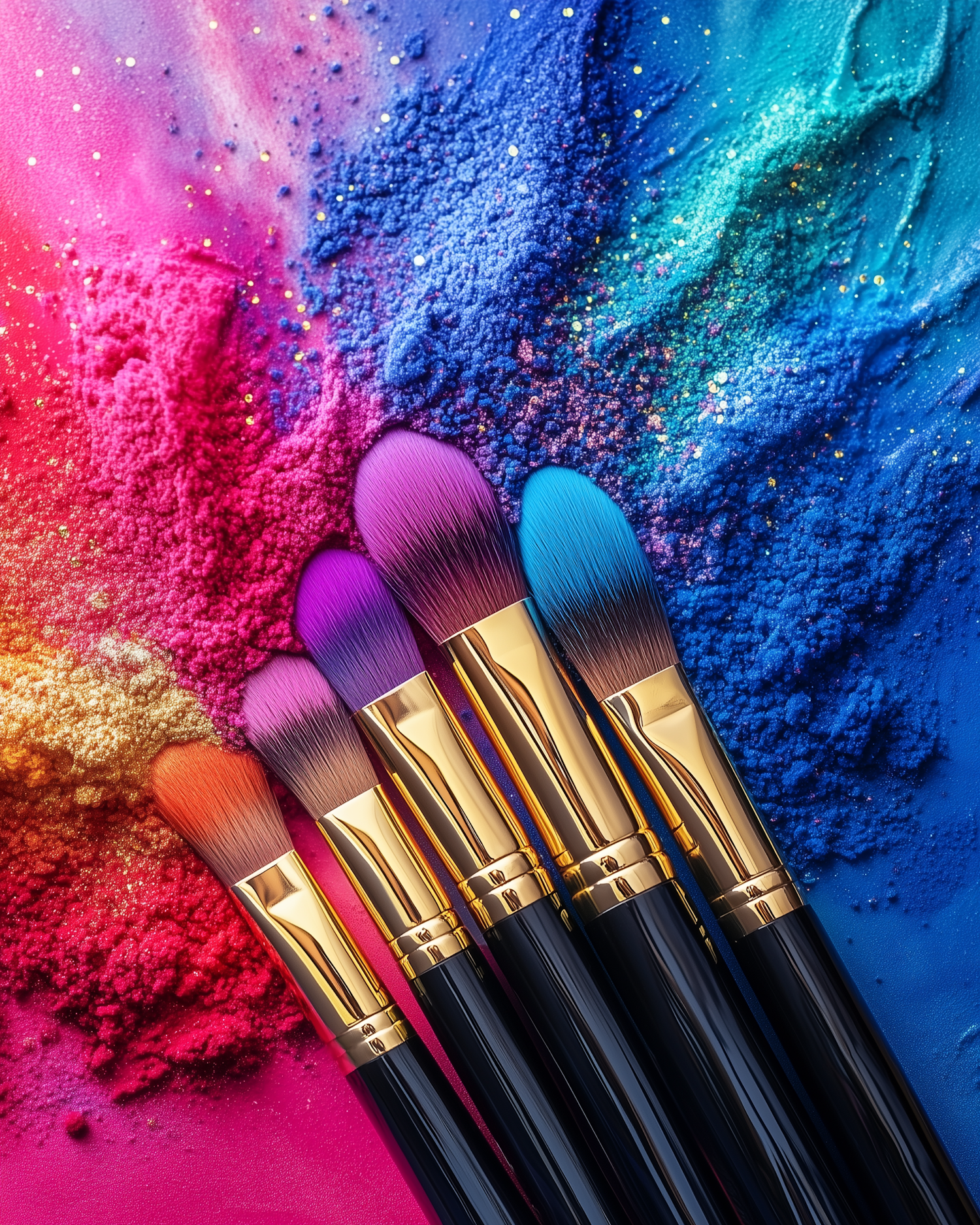 Vibrant makeup brushes with colorful bristles on a textured, glittery background of crushed powder in matching hues.