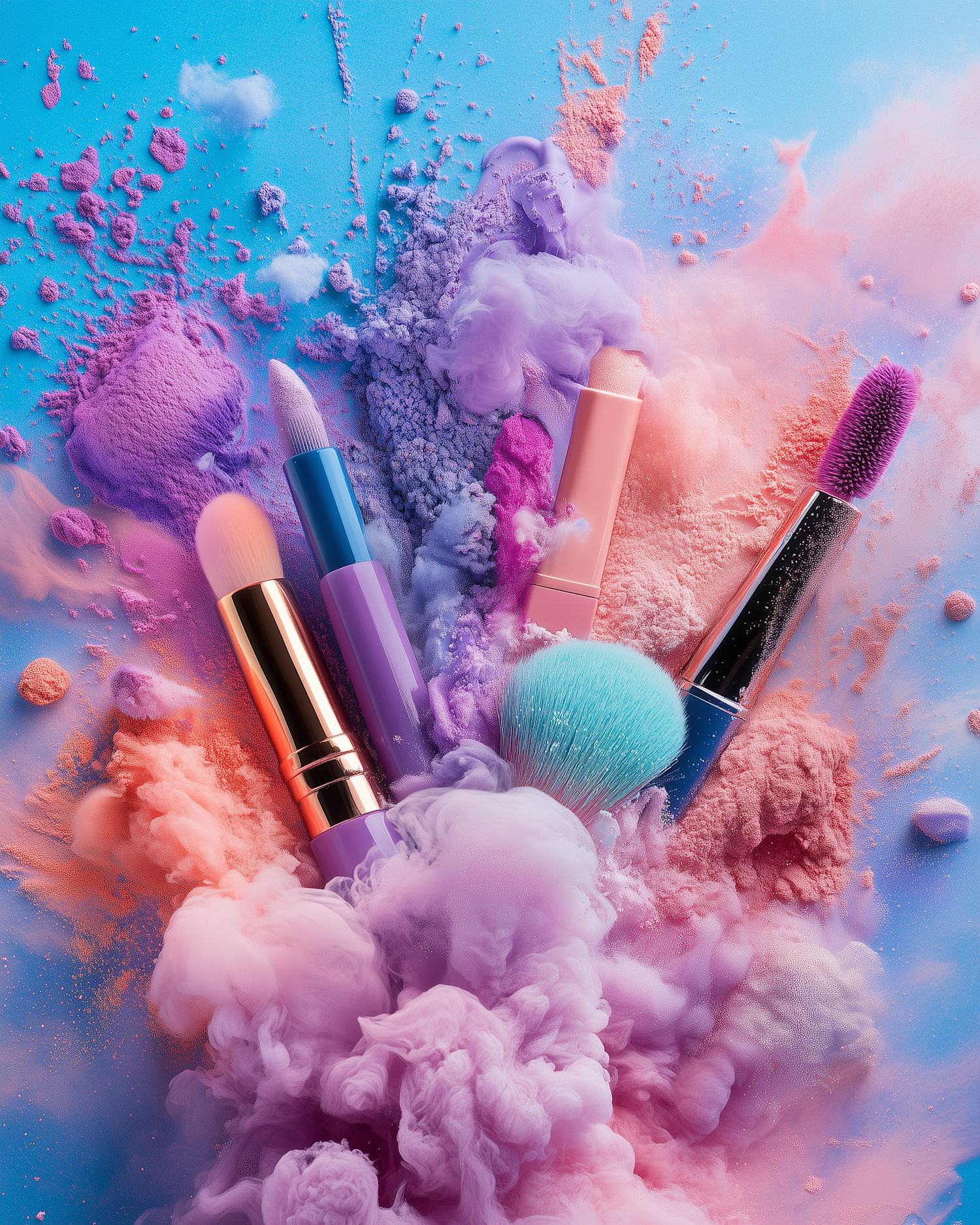 Vibrant makeup brushes and powders in motion, with swirling pink, purple, and peach hues on a blue background.