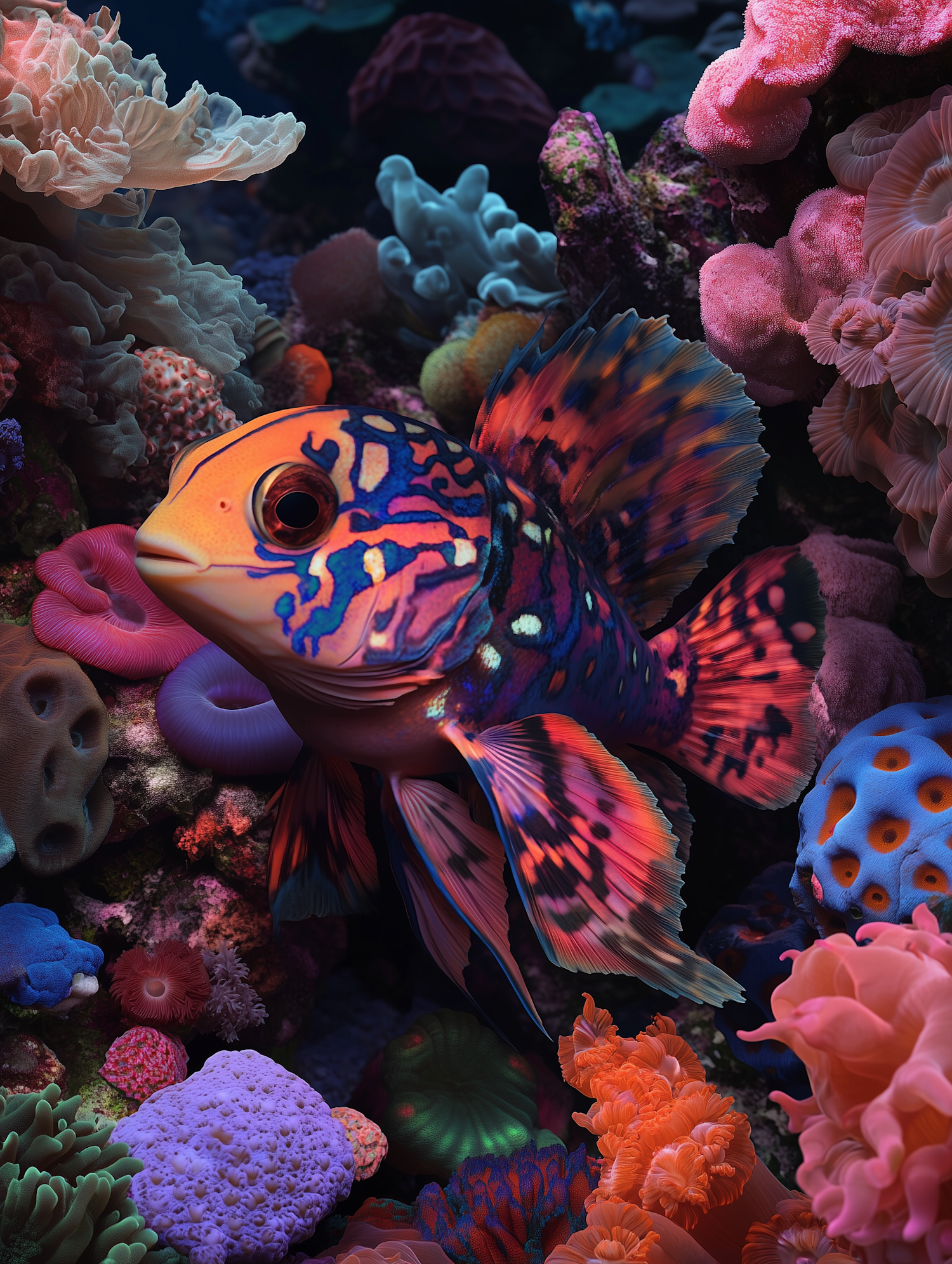 A stunning mandarin fish with vibrant orange and blue patterns swims among colorful coral in a lively underwater scene.