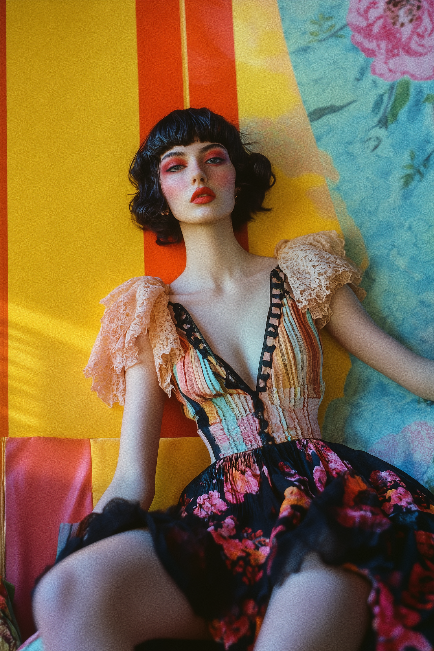 Realistic mannequin with bold makeup in a colorful dress against a vibrant, artistic background.