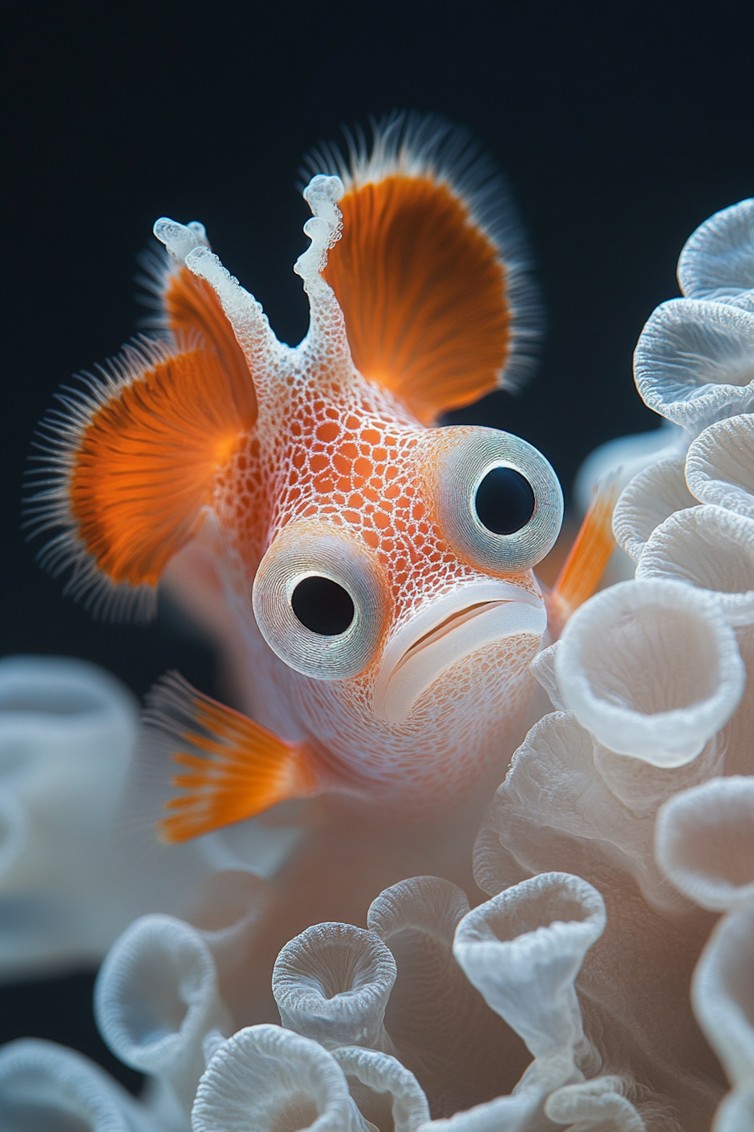 A whimsical close-up of a vibrant orange and white fish with large eyes, set against soft coral in an underwater scene.