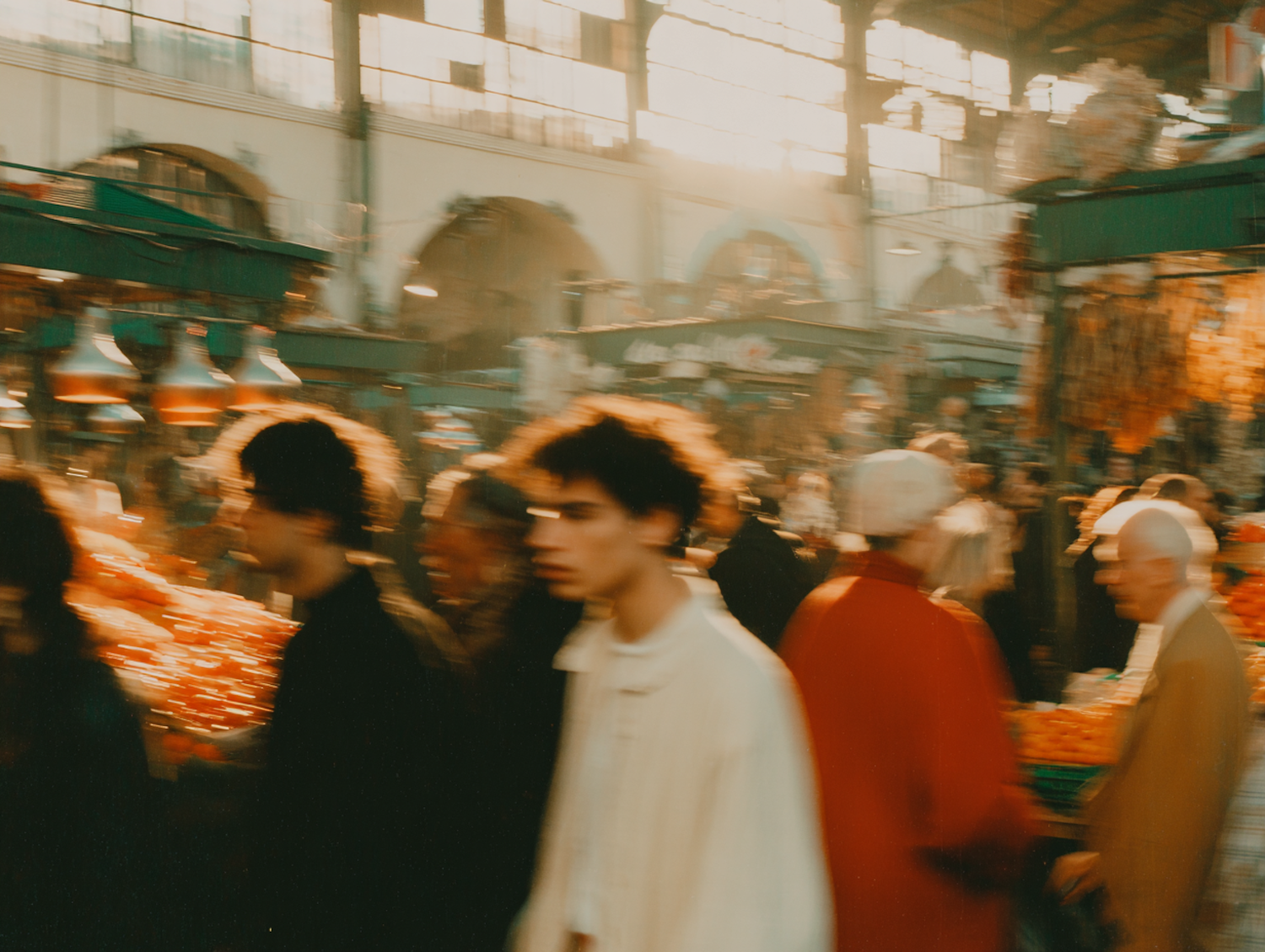 A vibrant indoor market scene with blurred motion, warm lighting, and bustling activity among colorful produce and goods.