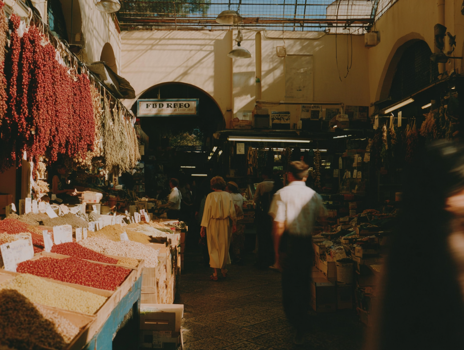 A vibrant market scene with colorful spices, hanging dried goods, and shoppers moving through a sunlit, arched marketplace.