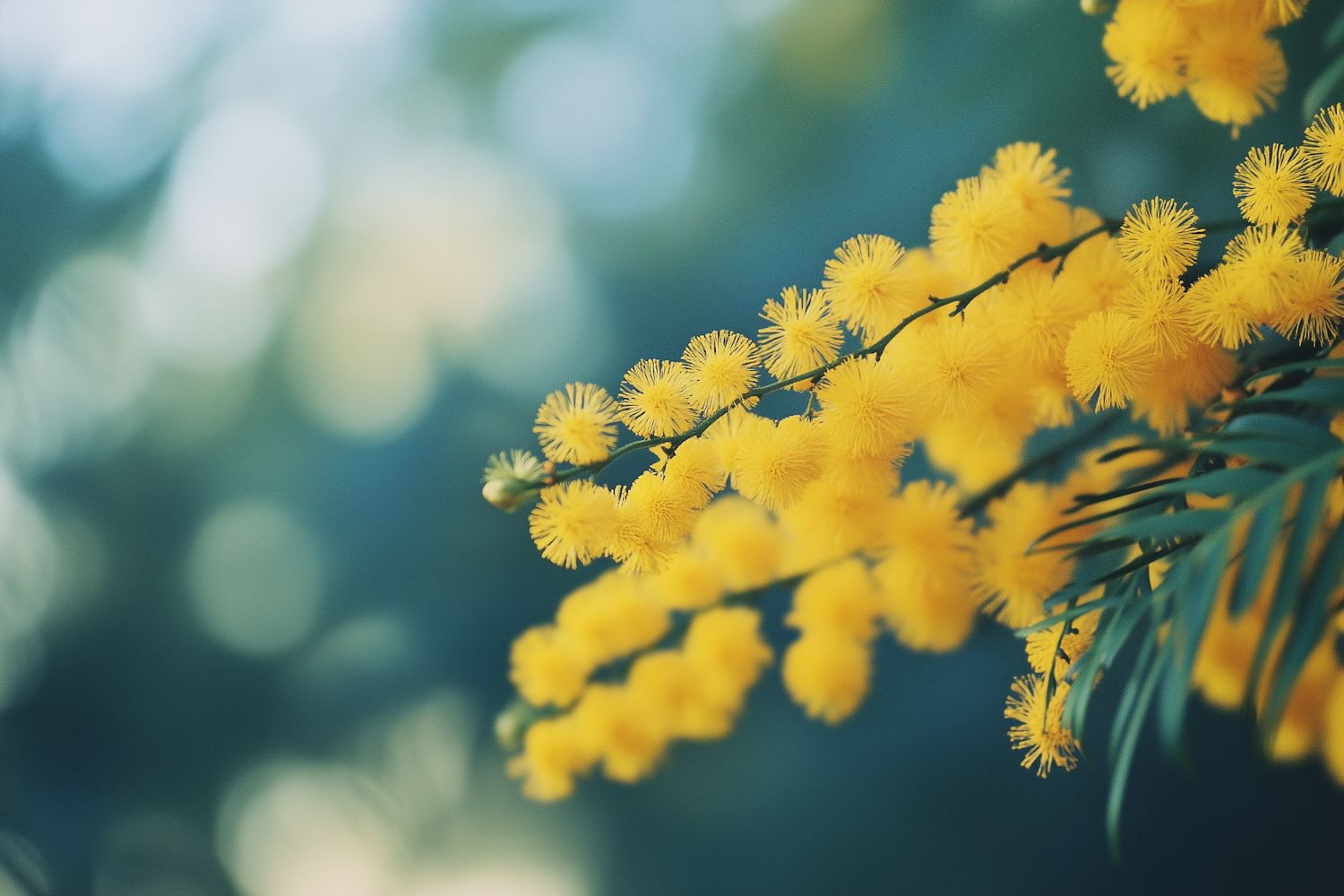 Bright yellow mimosa flowers in full bloom with a soft green and blue blurred background, creating a serene and dreamy vibe.