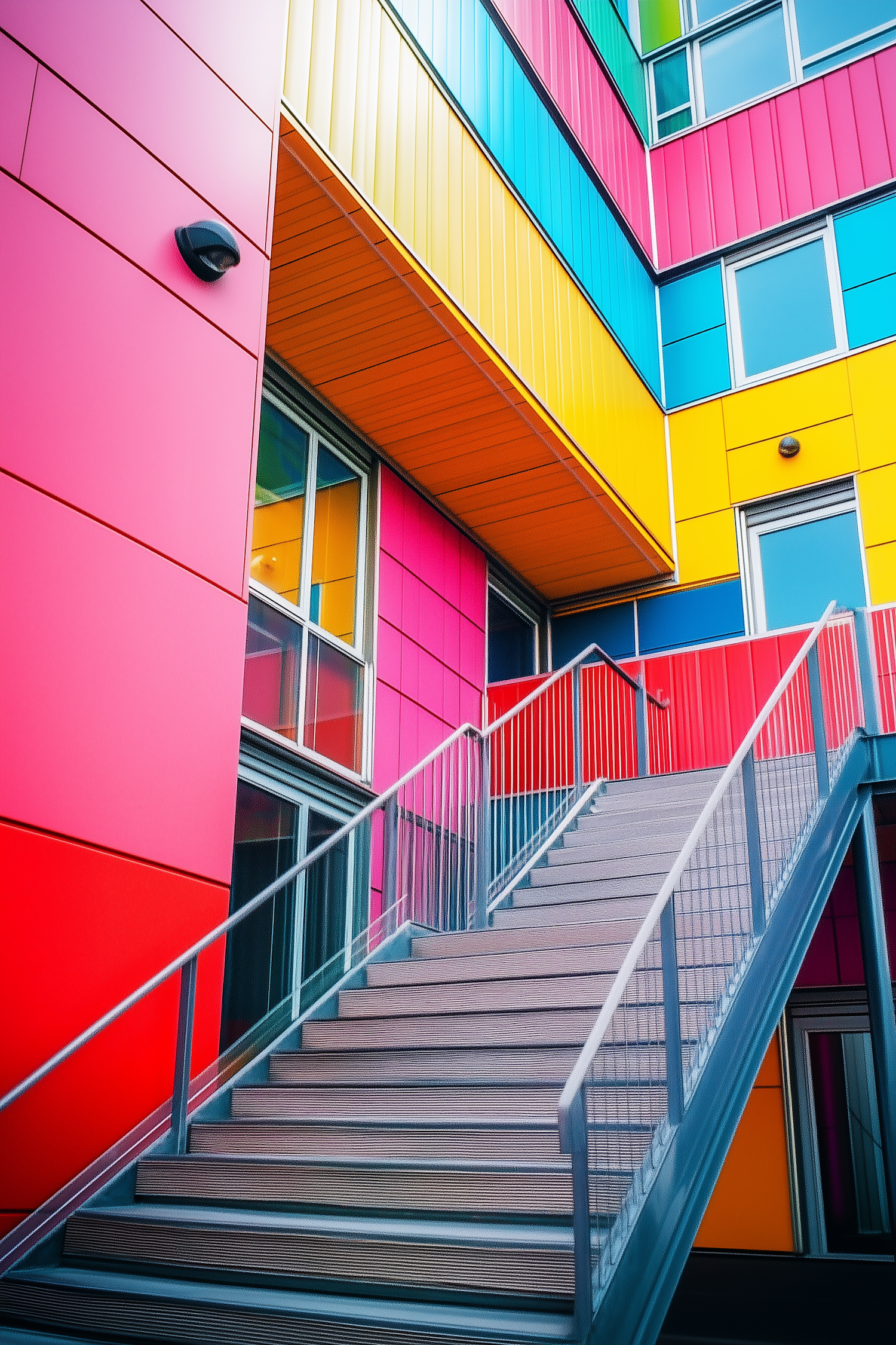 Colorful modern building facade with vibrant panels and sleek metal staircase, featuring bold geometric design and large windows.