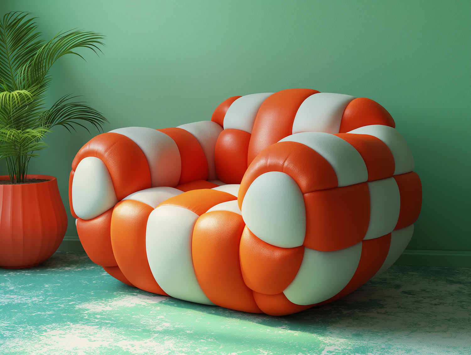 Modern armchair with orange and white checkered design against a mint green wall, paired with a potted plant for a stylish interior.