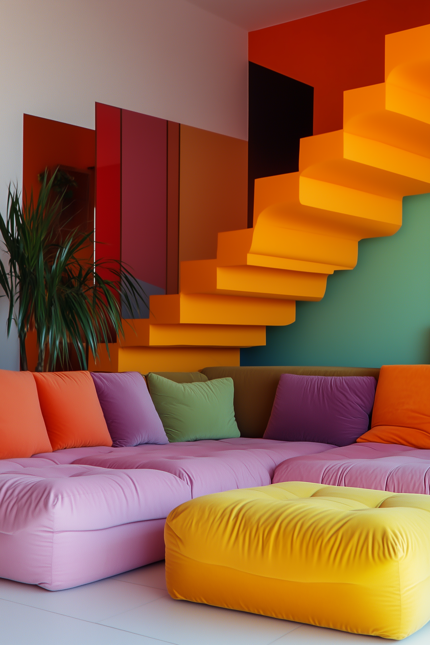 Vibrant living room with colorful sectional sofa, yellow ottoman, and bold orange staircase against a teal wall.