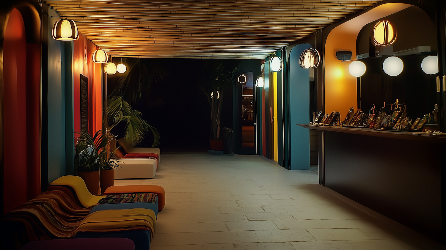 Vibrant interior with colorful walls, bamboo ceiling, pendant lights, and a display counter. Cozy seating and plants add warmth.