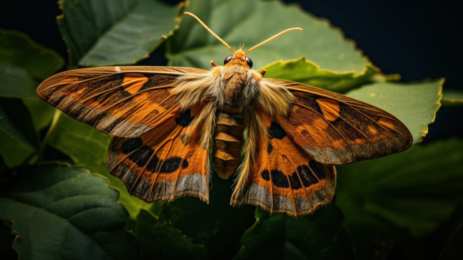 Close-up of a vibrant orange and black moth on green leaves, showcasing intricate wing patterns and textures.