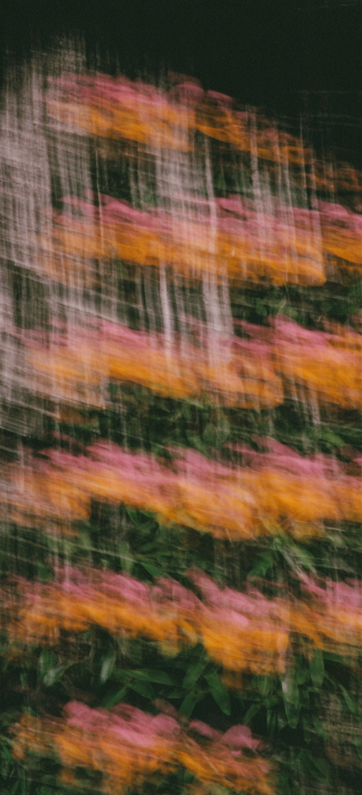 Abstract motion blur of pink and orange streaks with green accents, creating a dynamic and vibrant visual effect.