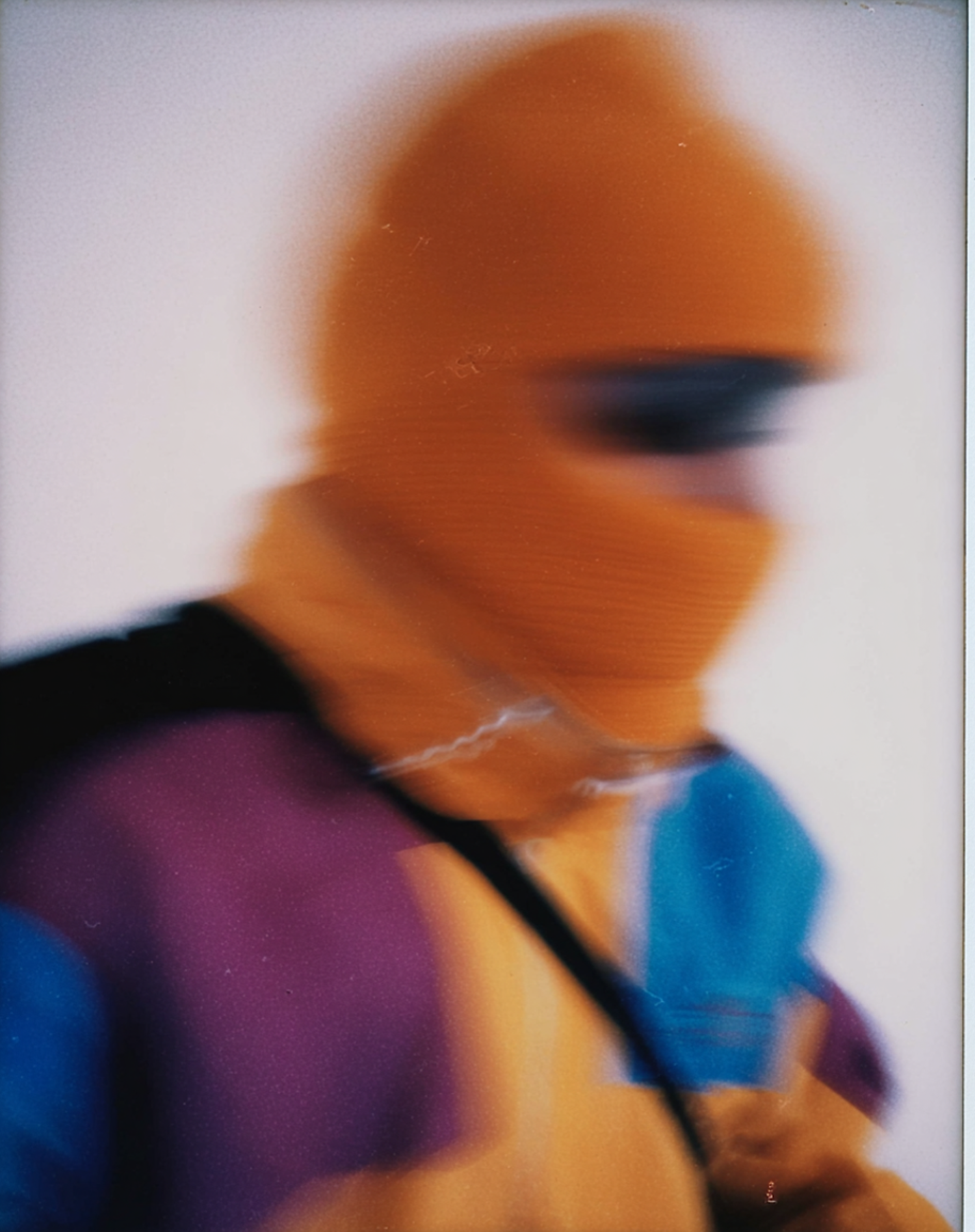 A blurred image of a person in an orange balaclava and a colorful jacket, creating an abstract and dynamic visual effect.