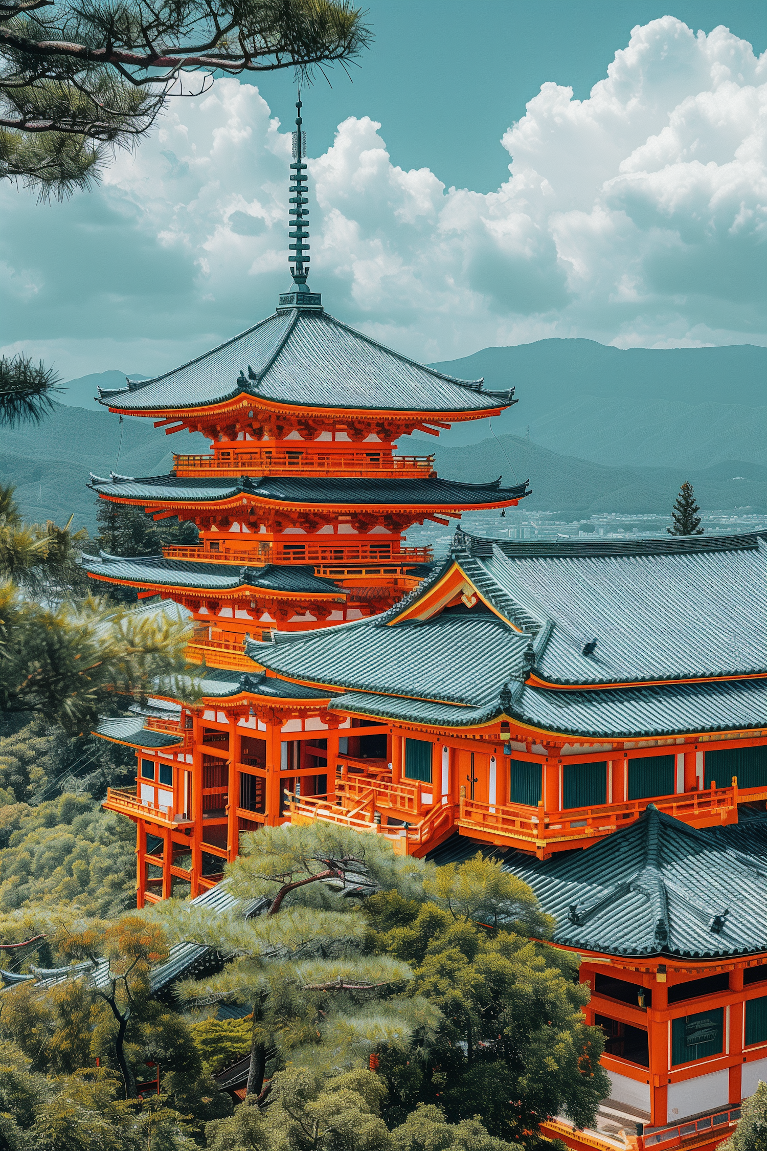 Vibrant Japanese pagoda with orange and green hues, set against lush greenery and mountains under a cloudy sky.