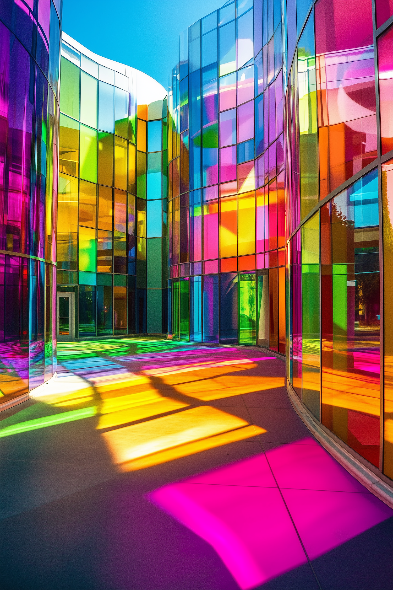 Colorful modern building with multicolored glass panels casting vibrant reflections and shadows in a dynamic architectural scene.