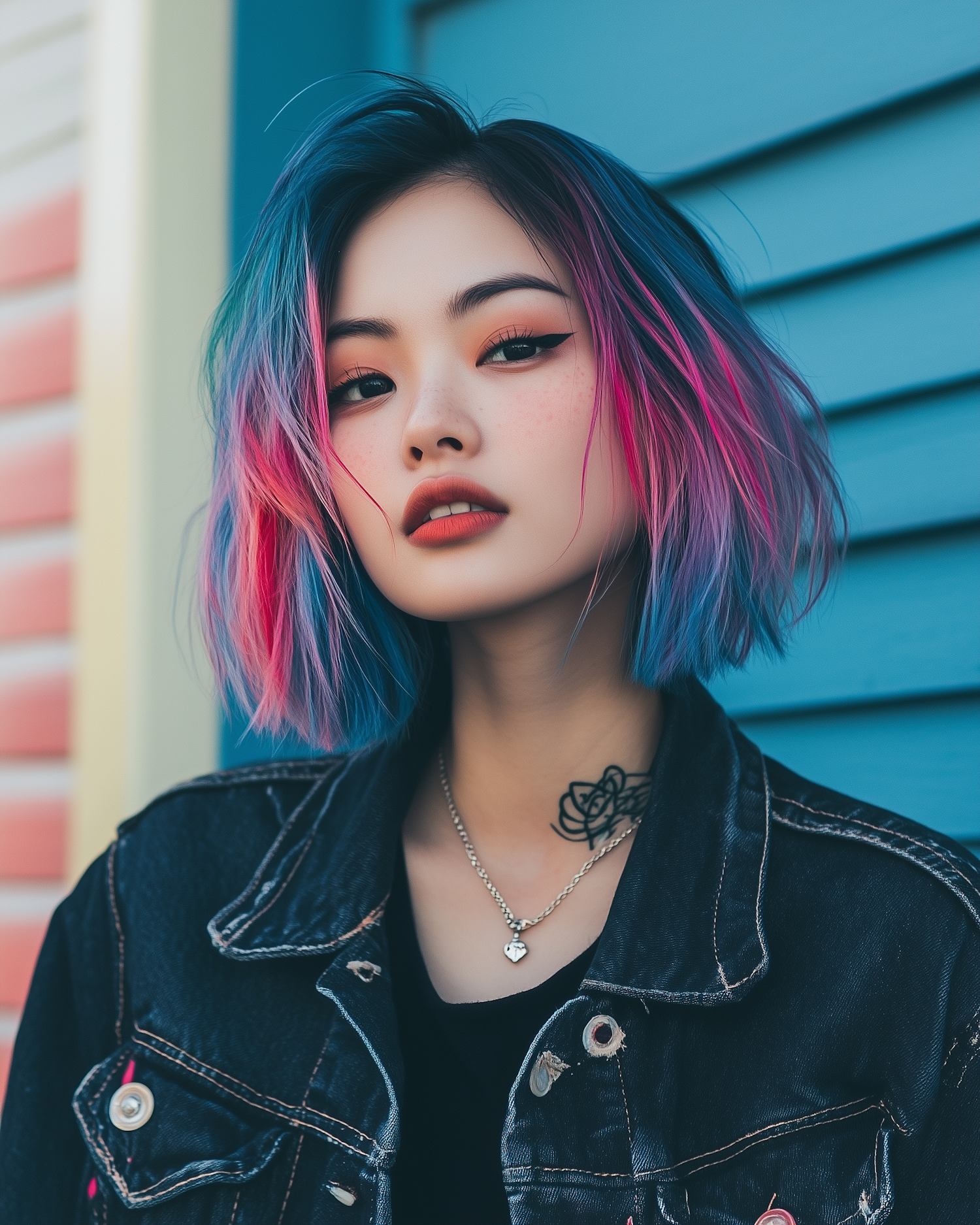 Stylish woman with vibrant blue and pink hair, denim jacket, and rose tattoo against a colorful wall.