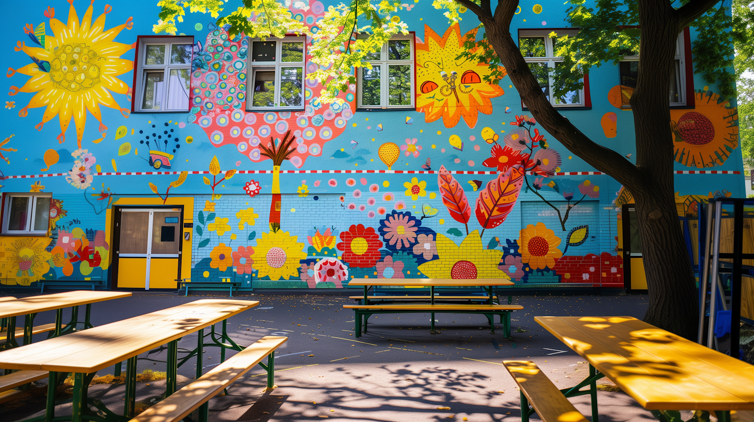 Colorful mural on a building with picnic tables and tree shade, creating a vibrant and inviting outdoor space.