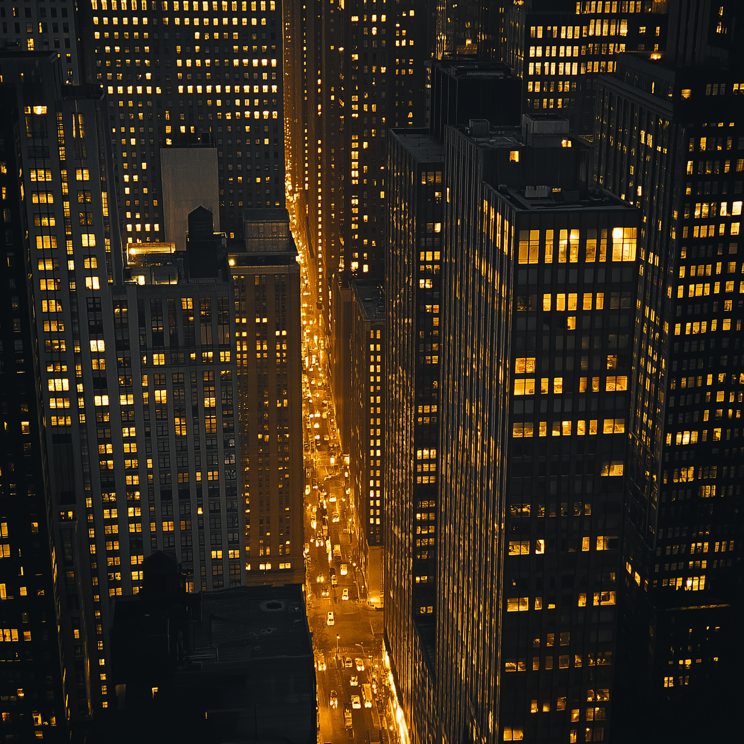 Nighttime cityscape with glowing skyscraper windows and a golden-lit street filled with cars, creating a vibrant urban atmosphere.