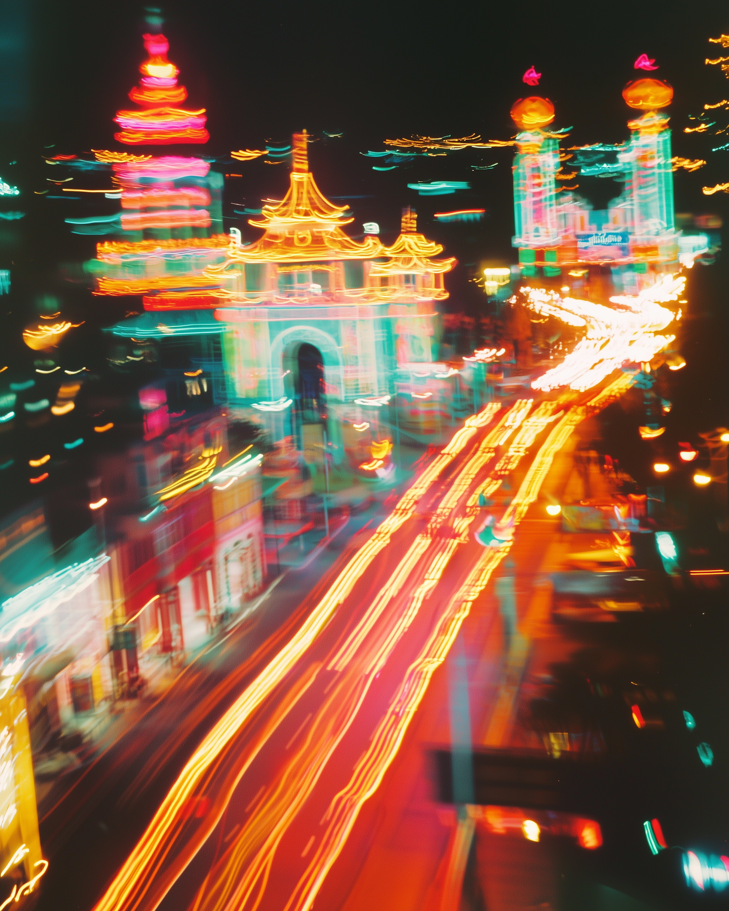 Colorful long-exposure shot of a neon-lit street with traditional Chinese architecture and vibrant light trails at night.