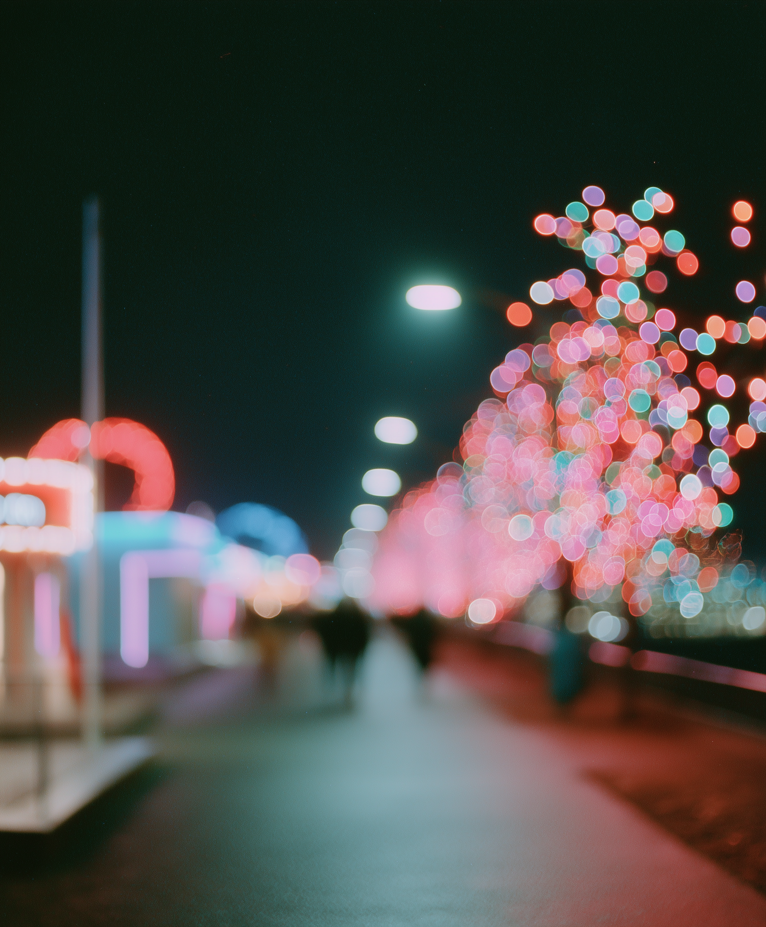 A blurred nighttime promenade with colorful bokeh lights, silhouettes of people, and a festive atmosphere.