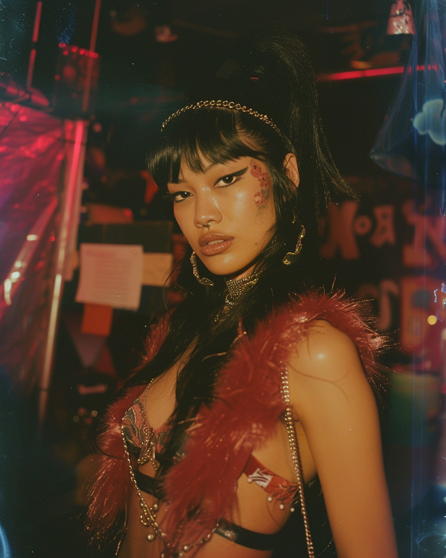 Asian woman with bold makeup and red feathered outfit in a dimly lit, colorful setting, exuding confidence and style.