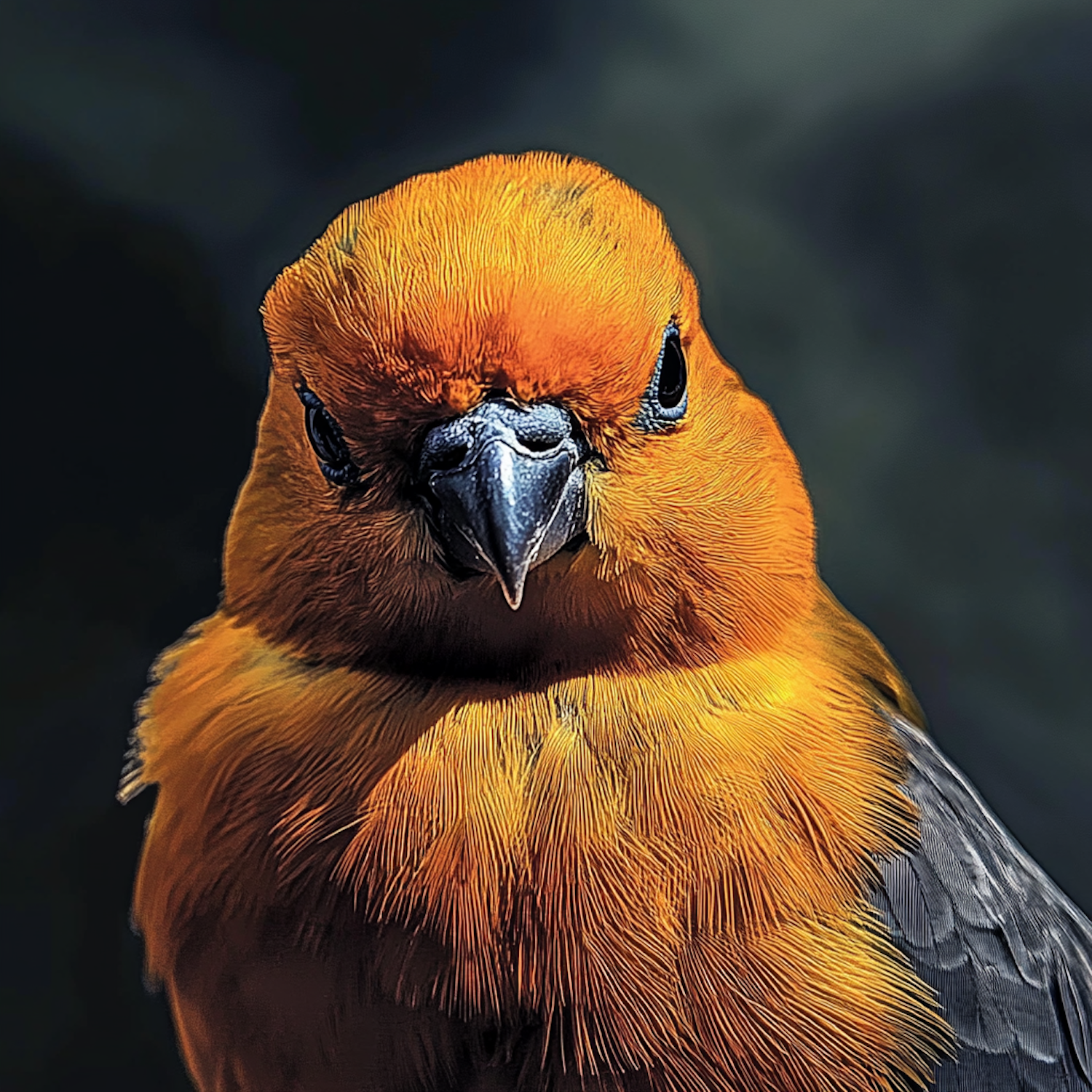 Close-up of a vibrant orange bird with a black beak and intense eyes, set against a dark background, highlighting its vivid plumage.