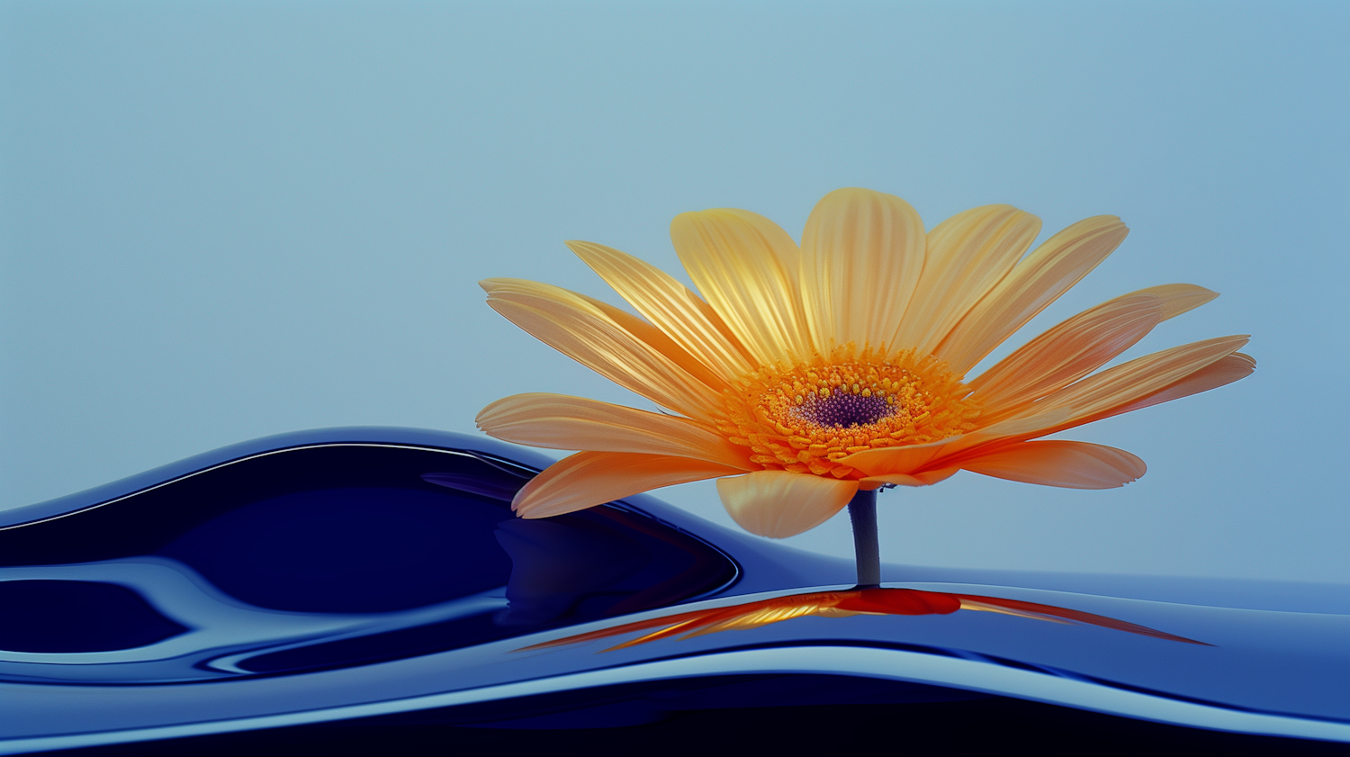A vibrant orange daisy on a glossy blue surface with a soft blue background, creating a serene and elegant composition.