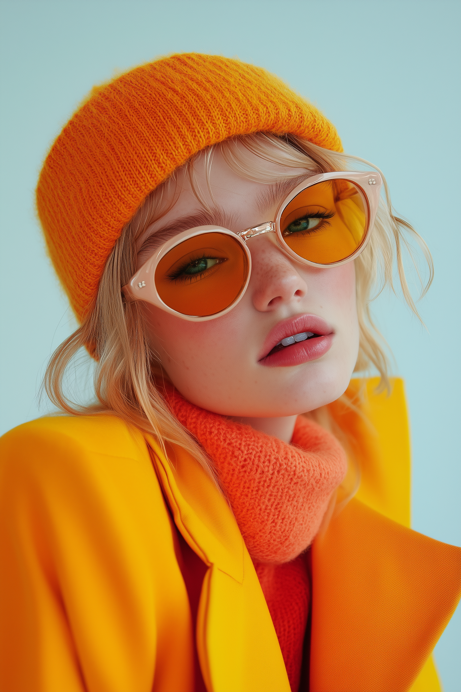 Stylish woman in orange beanie and sunglasses, wearing a matching blazer and turtleneck against a light blue background.