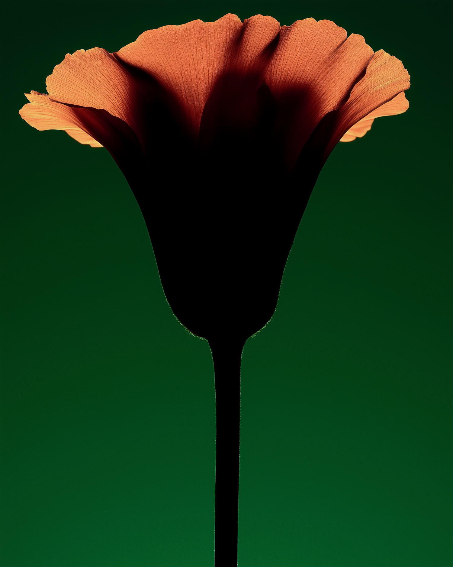 A vibrant orange flower with textured petals against a rich green background, showcasing a dramatic silhouette and elegant lighting.