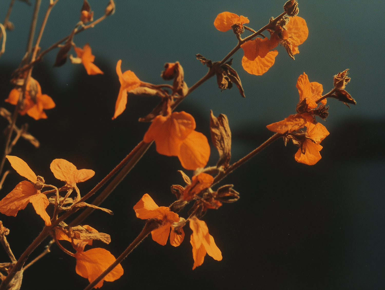 Vibrant orange flowers with delicate petals on slender stems against a dark, blurred background, creating a striking contrast.