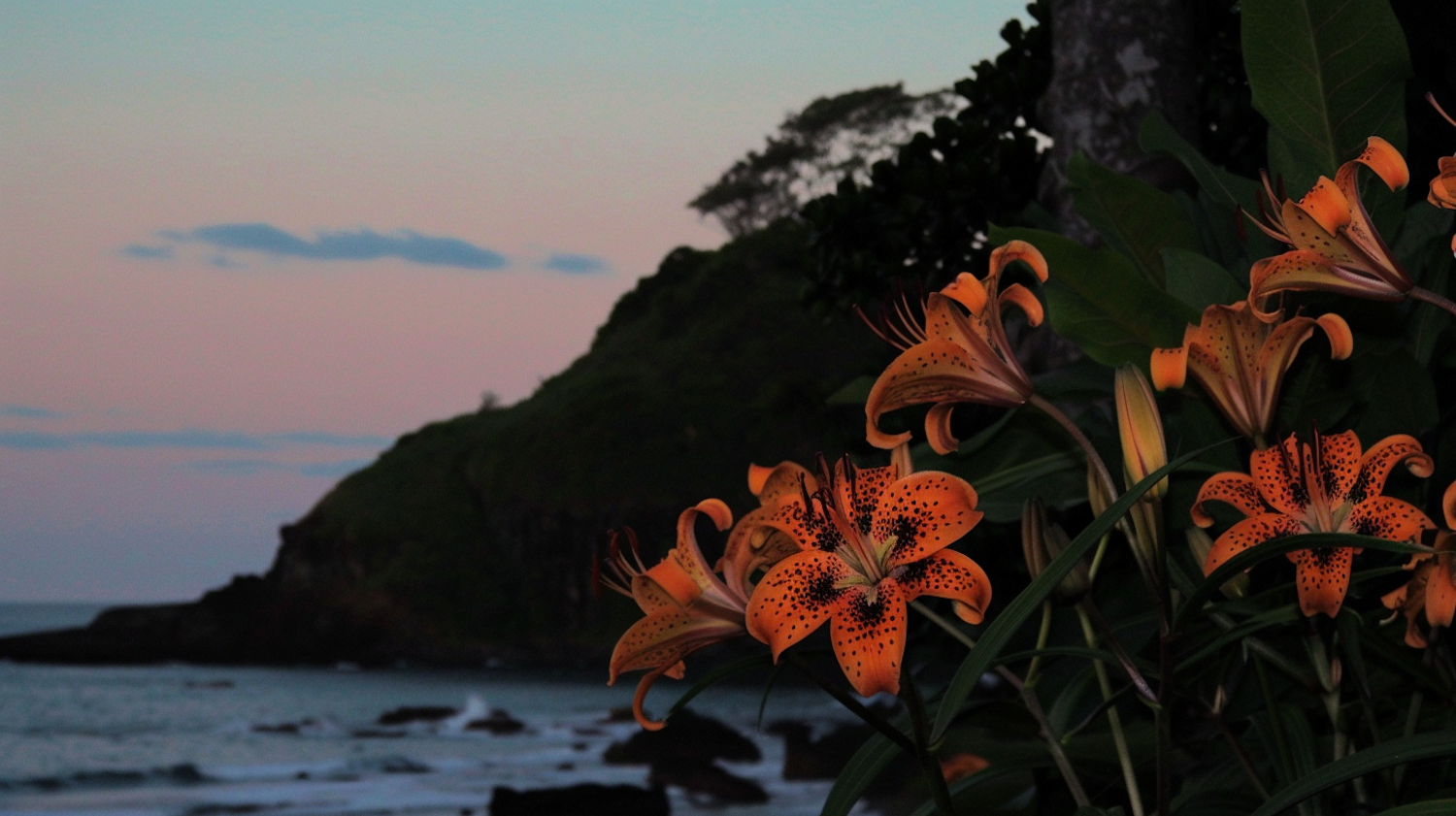 Orange lilies with speckles in focus against a serene coastal backdrop at dusk, featuring pastel skies and gentle ocean waves.