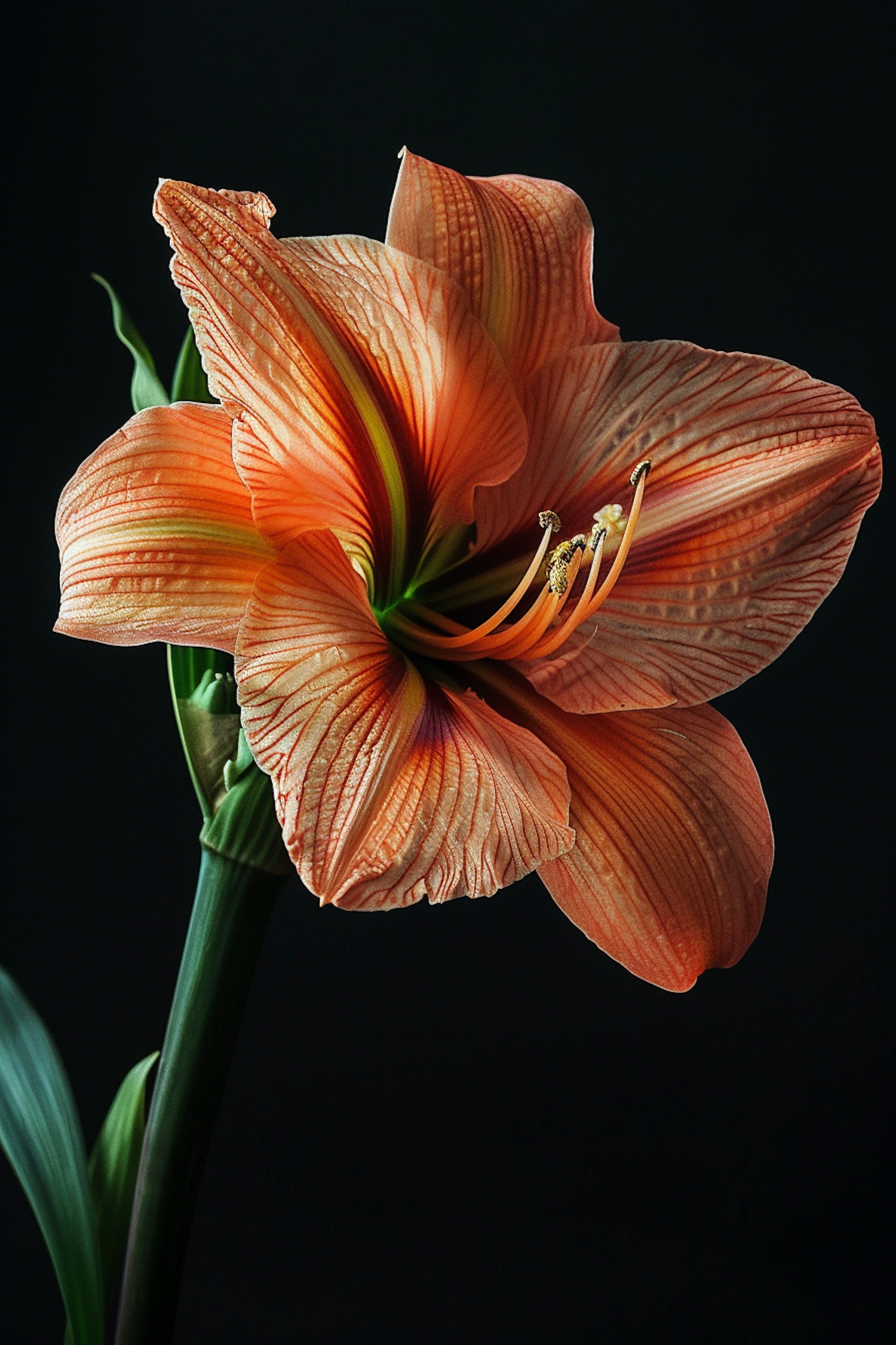 Vibrant orange amaryllis flower with red veins and green stem against a dark background, highlighting its elegant and intricate beauty.