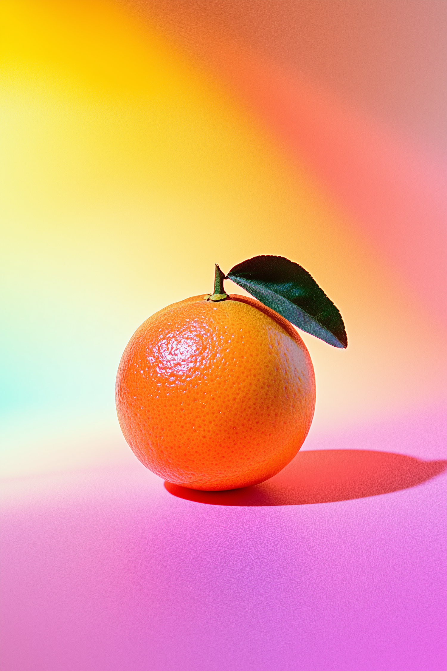 Vibrant orange with a green leaf against a warm gradient background, showcasing freshness and vitality in a colorful setting.