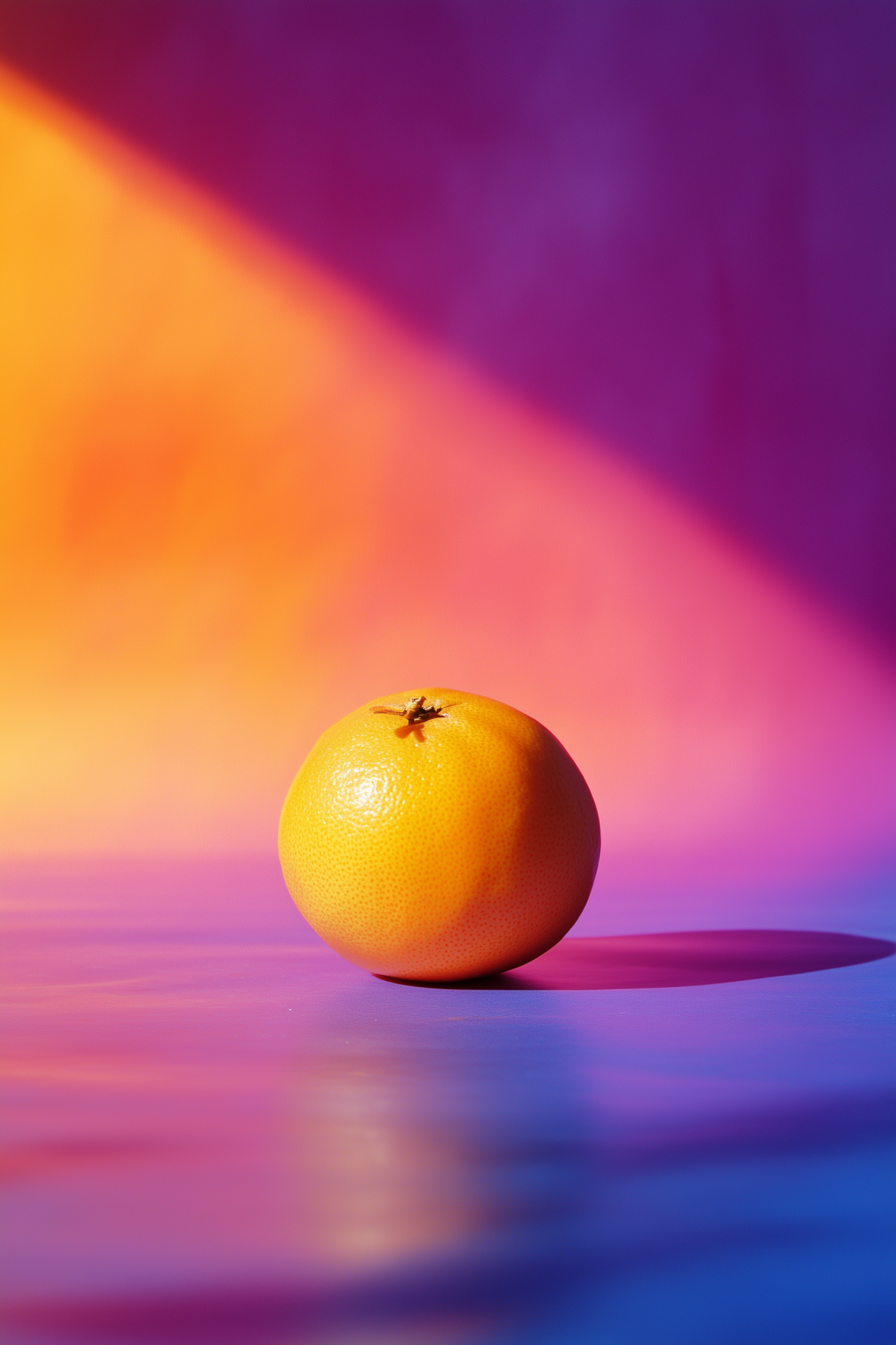 Vibrant orange against a colorful gradient background, featuring purple, orange, and pink hues. Artistic and lively composition.