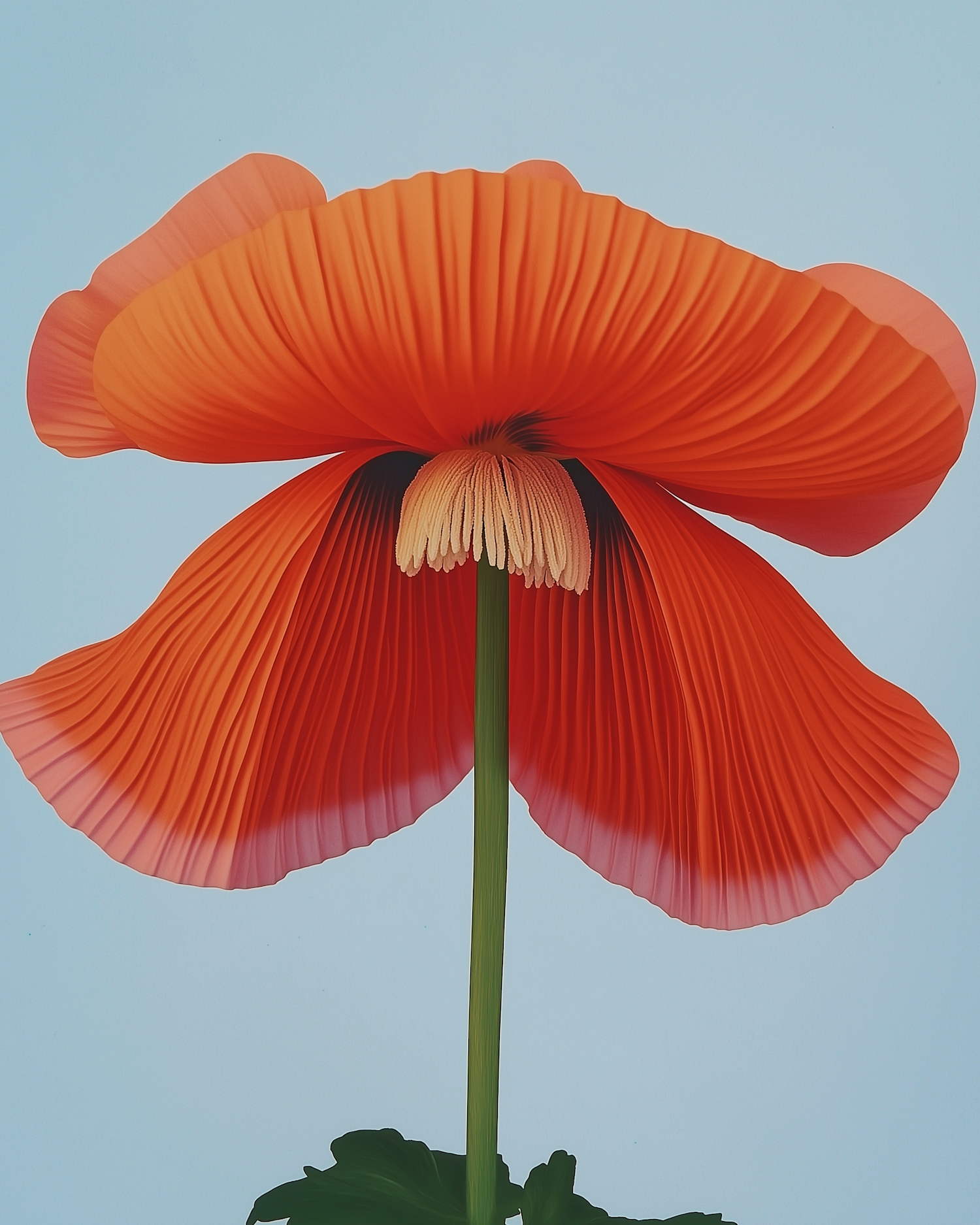 Close-up of a vibrant orange flower with pleated petals against a clear blue sky, showcasing its delicate structure and vivid colors.