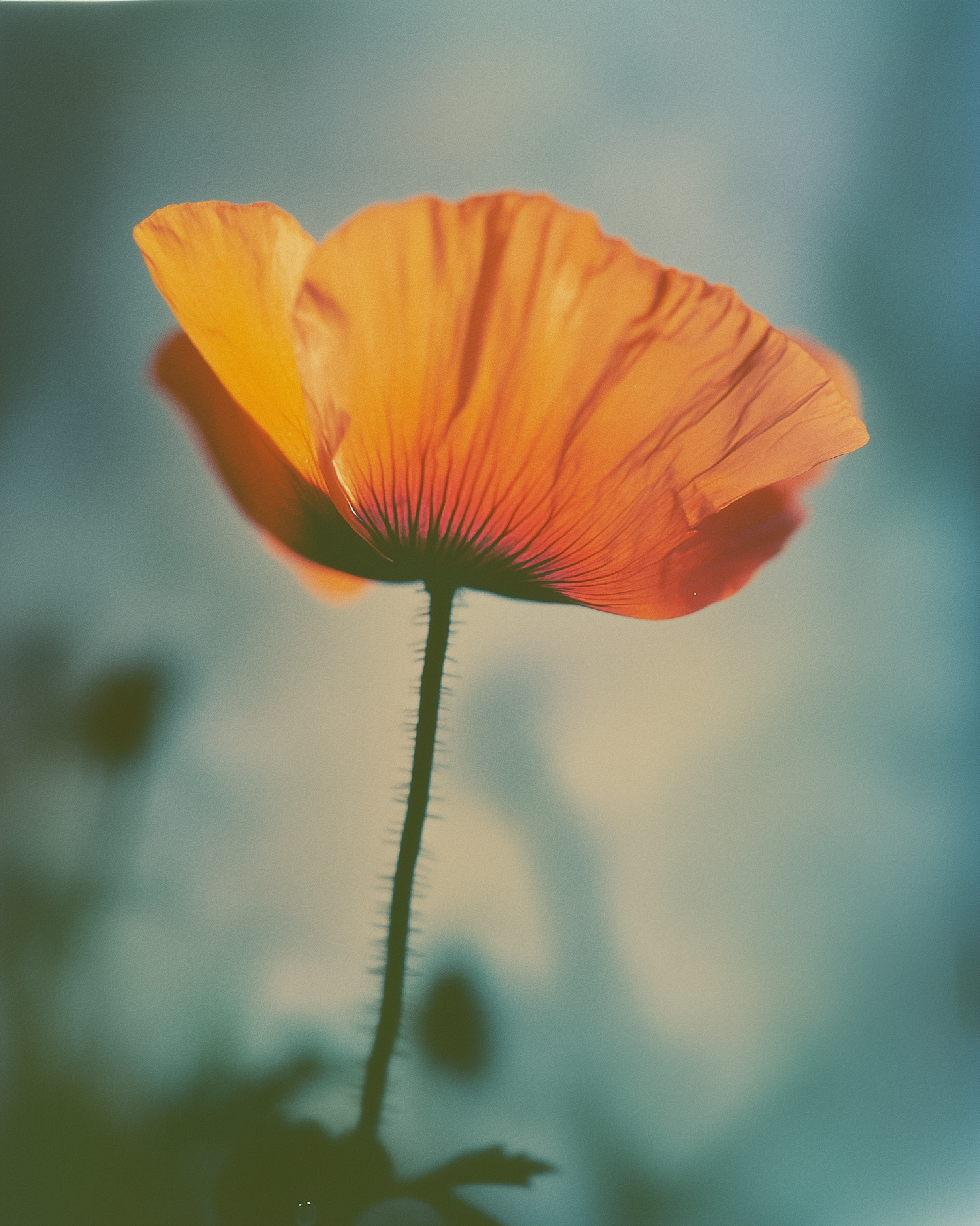 Close-up of a vibrant orange poppy flower with a soft, blurred background, highlighting its delicate petals and slender stem.
