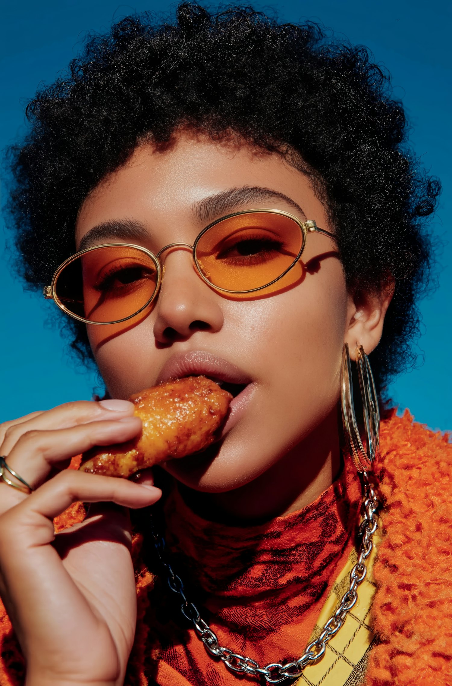 Stylish individual in orange sunglasses and bold outfit enjoying a glazed snack against a vibrant blue sky.