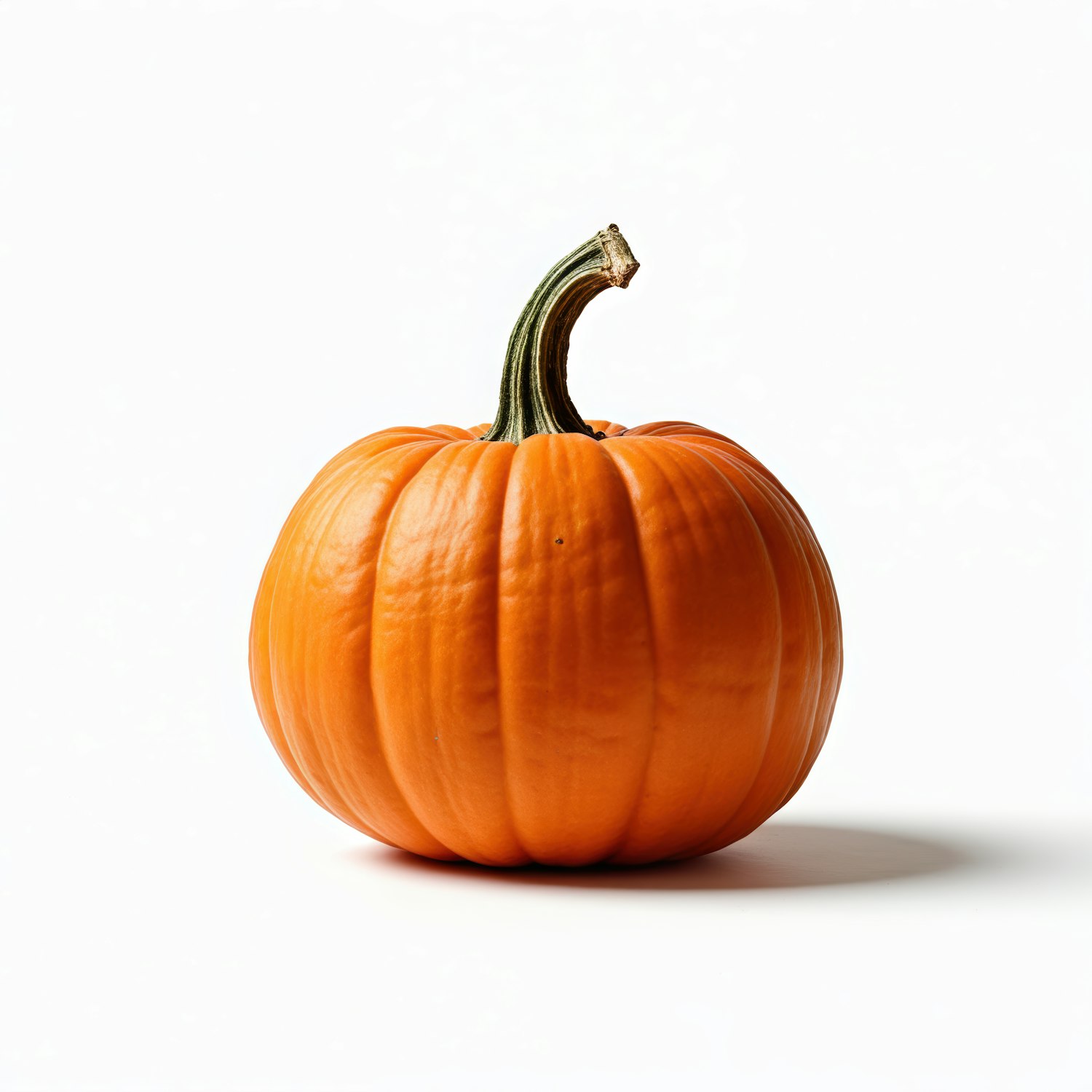 Bright orange pumpkin with green stem on a white background, showcasing autumnal beauty and simplicity.