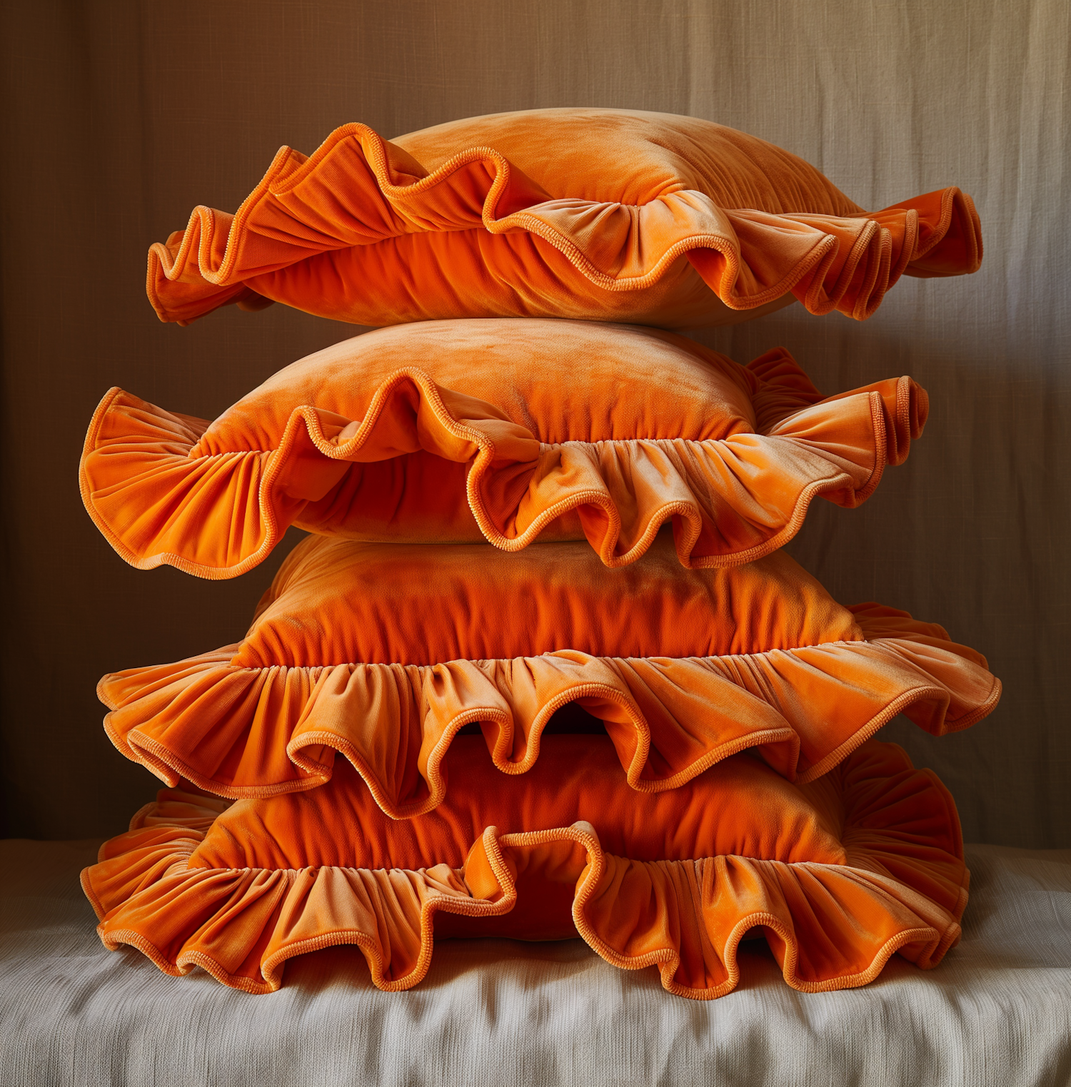 Stack of four vibrant orange pillows with ruffled edges on a neutral background, showcasing elegant design and rich texture.