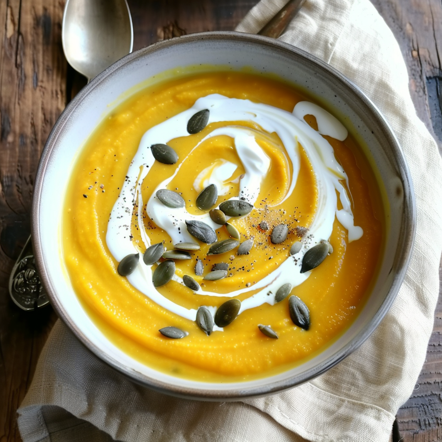 Creamy pumpkin soup with cream swirl and pumpkin seeds in a rustic bowl on a wooden table, perfect for a cozy autumn meal.