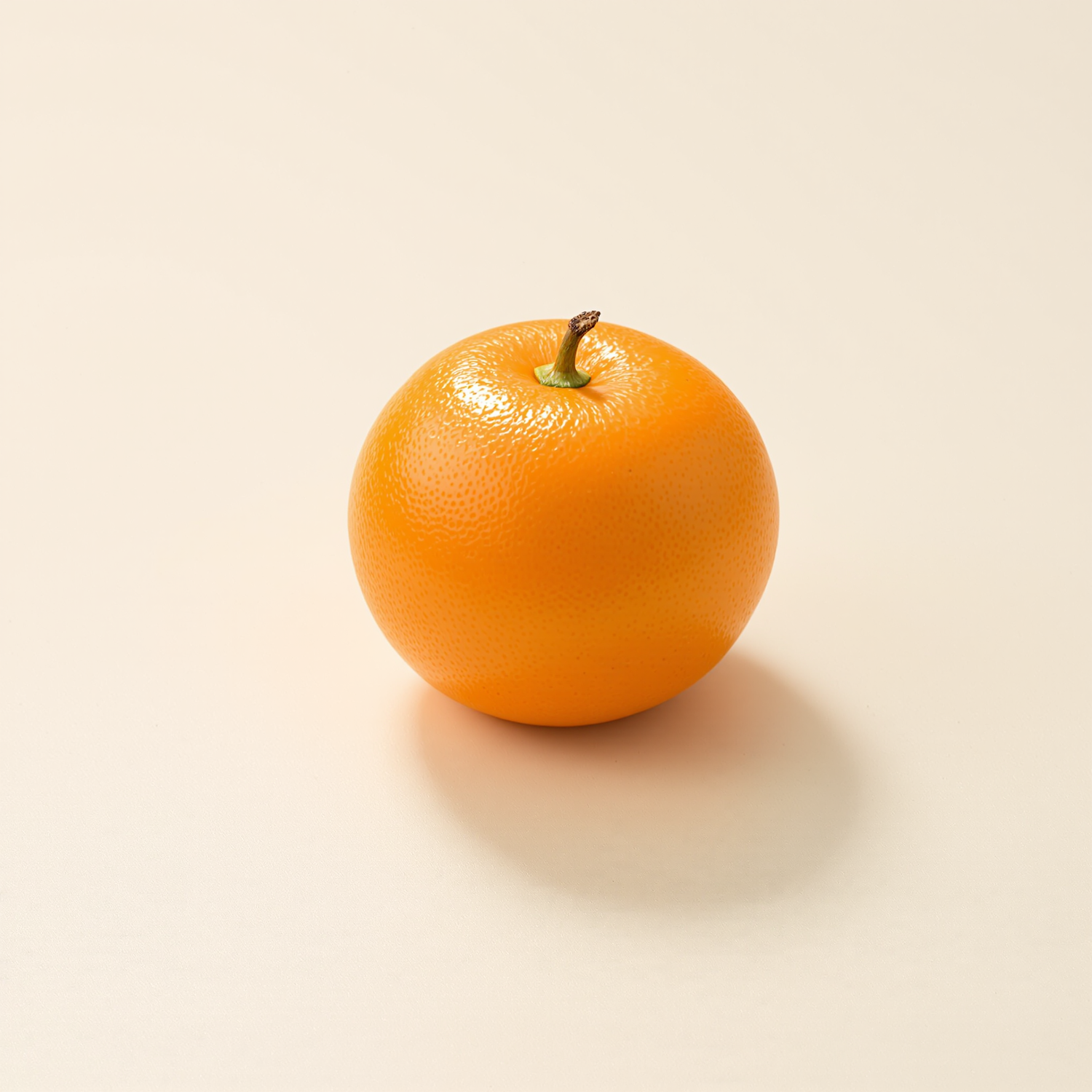 A vibrant orange fruit on a smooth beige surface, showcasing its textured peel and a small green stem under soft lighting.