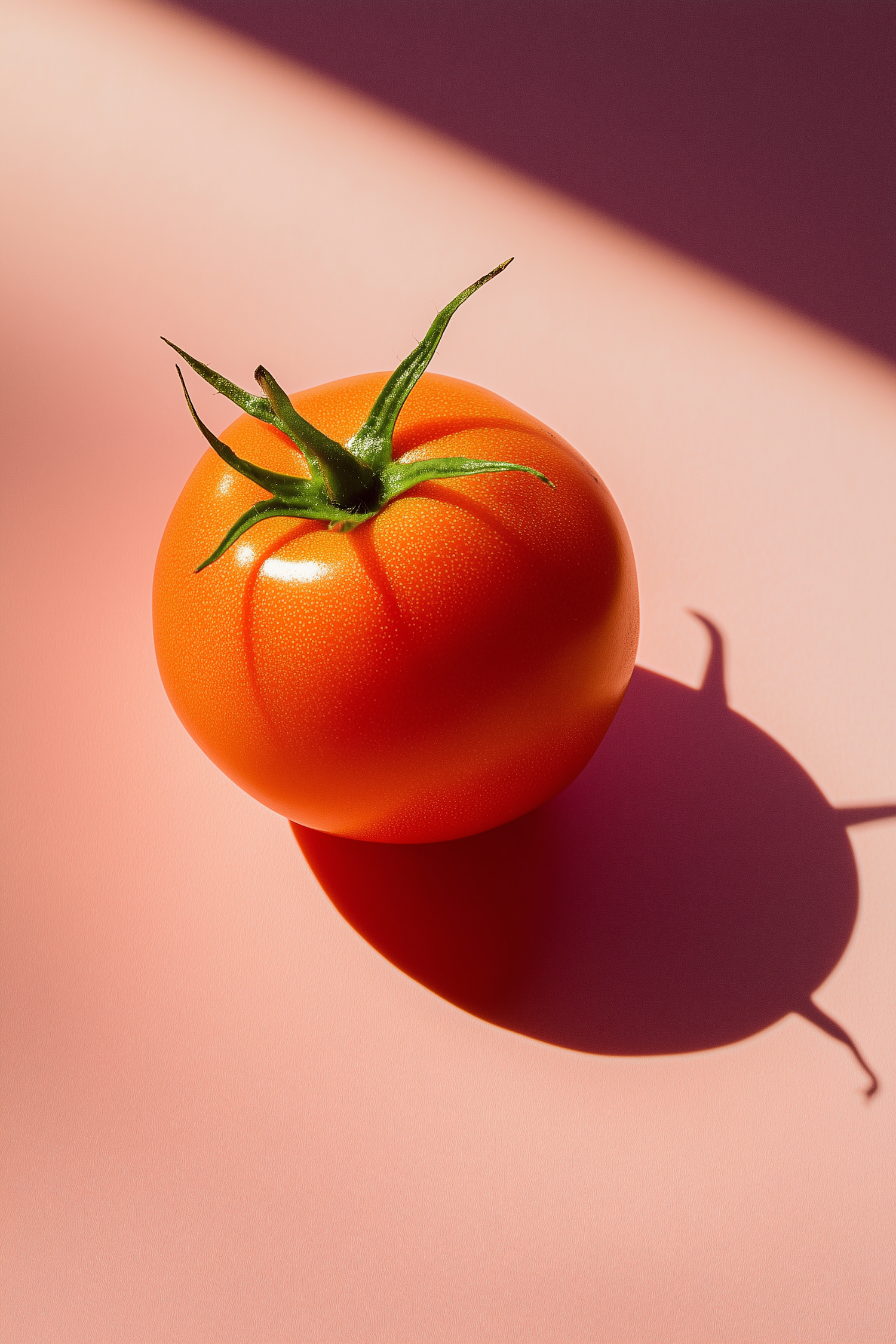 A ripe tomato on a light pink surface with dramatic lighting and shadow, highlighting its vibrant color and smooth texture.