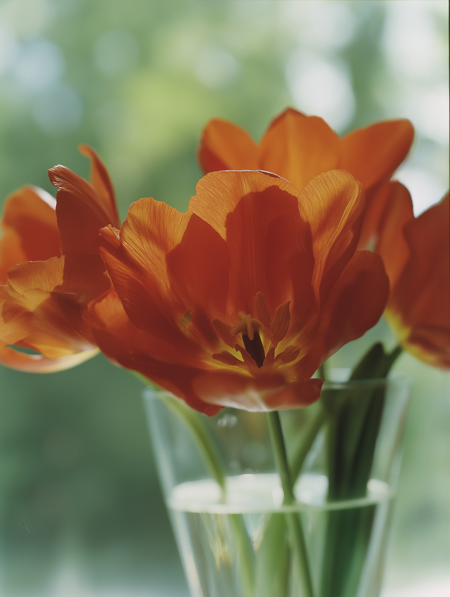 Close-up of vibrant orange tulips in a glass vase, beautifully lit with a soft green blurred background, perfect for nature lovers.