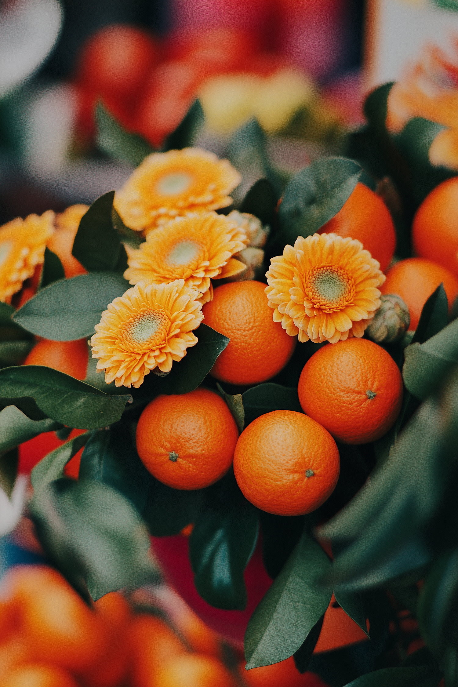 Bright orange gerbera daisies paired with fresh oranges and green leaves in a vibrant, colorful arrangement.