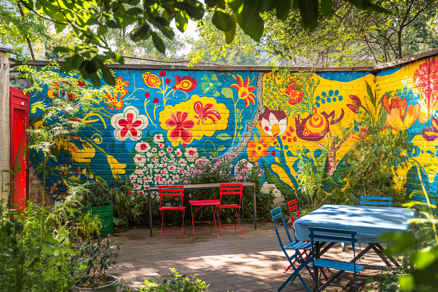 Colorful garden with vibrant floral mural, red and blue chairs, lush greenery, and dappled sunlight on a paved patio.