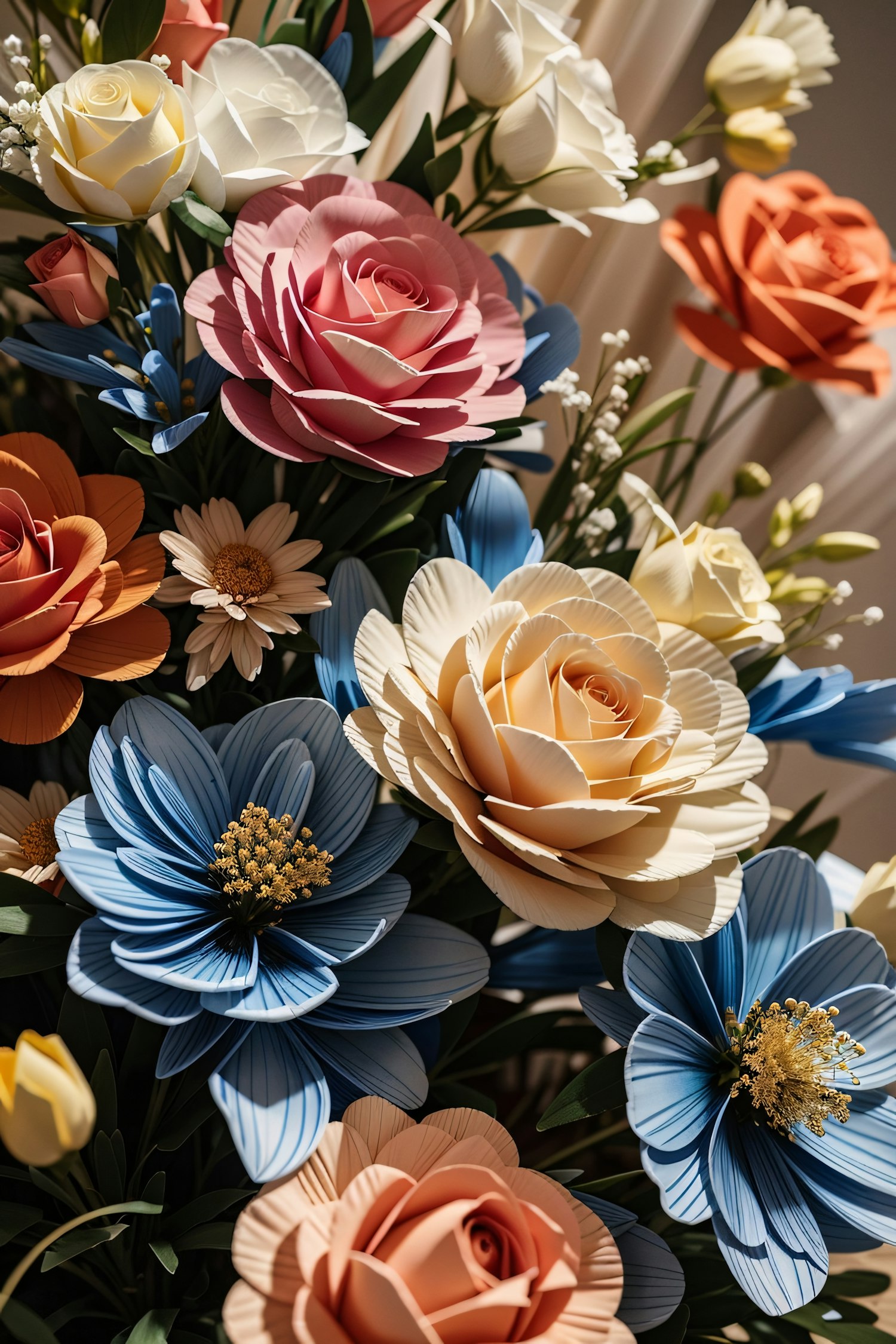 Intricate paper flower arrangement with vibrant roses and blue blossoms, showcasing detailed craftsmanship and vivid colors.