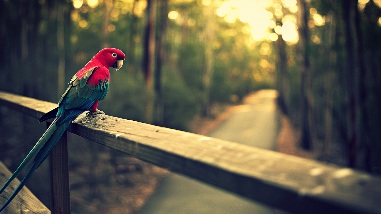 A vibrant red and green parrot perched on a wooden railing in a sunlit forest path, creating a serene and colorful scene.