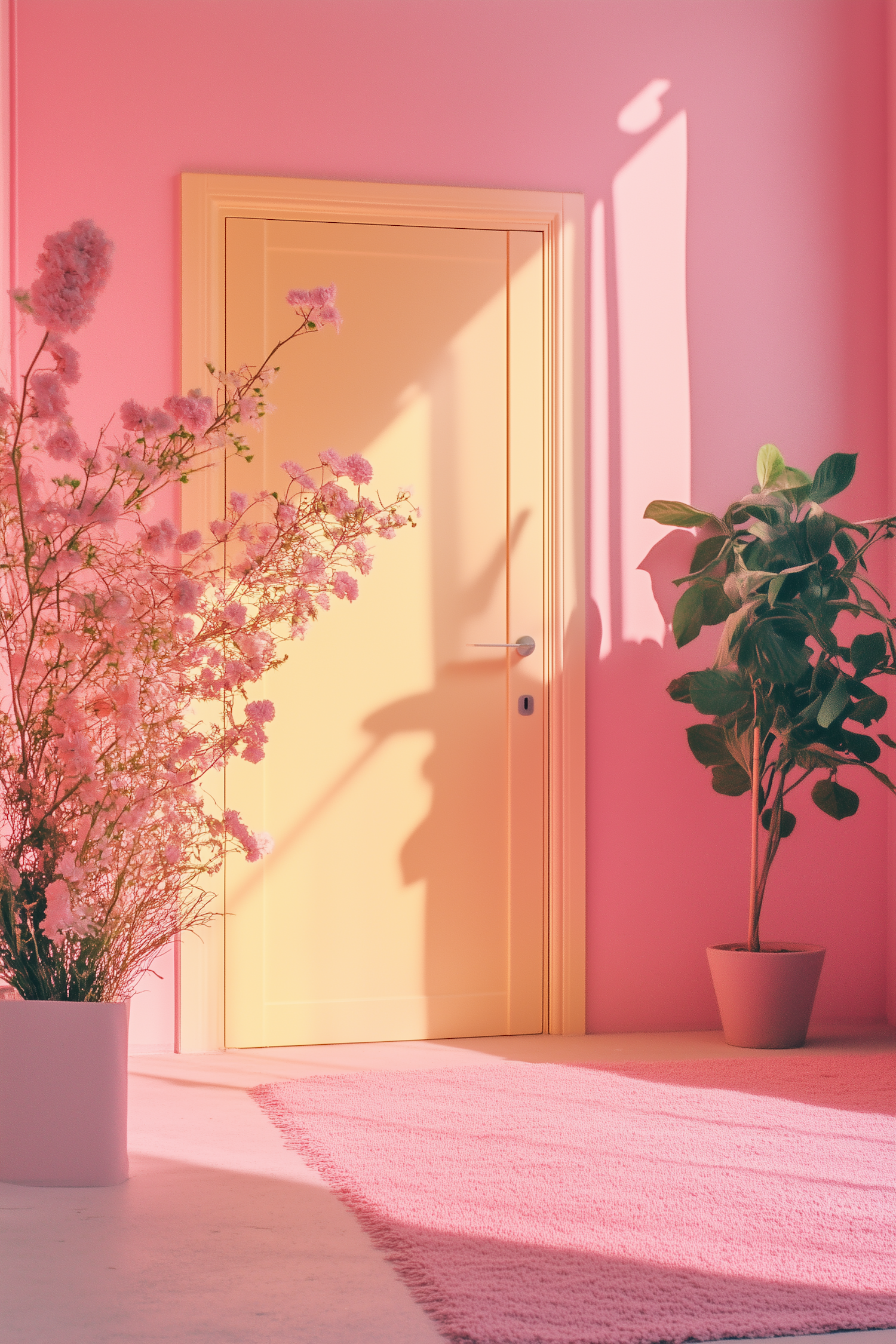 Bright pastel room with yellow door, pink walls, and lush plants. Sunlight casts soft shadows, creating a warm, inviting atmosphere.