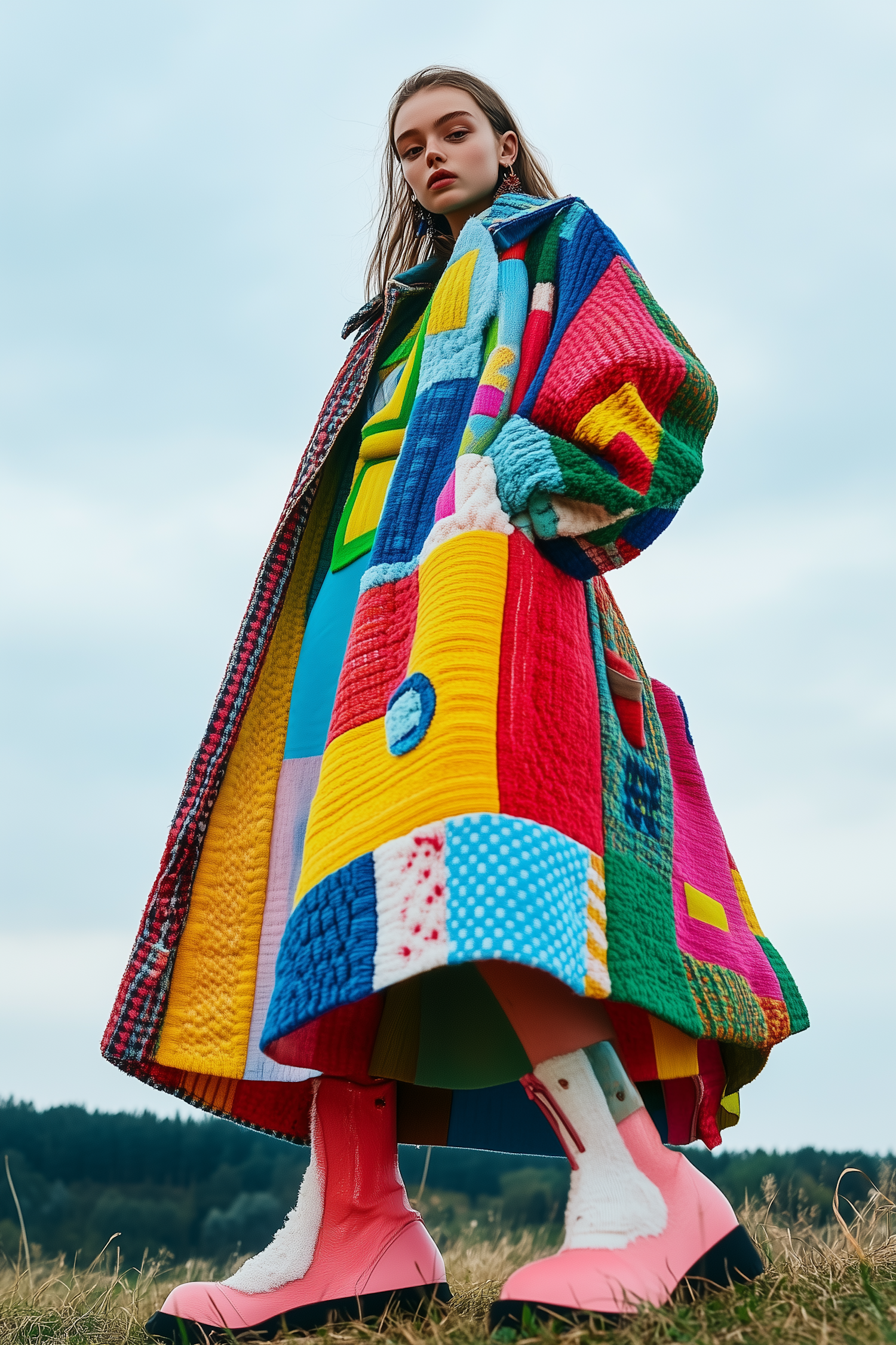 A young woman in a bold, colorful patchwork coat and pink boots stands confidently in a grassy field under a cloudy sky.