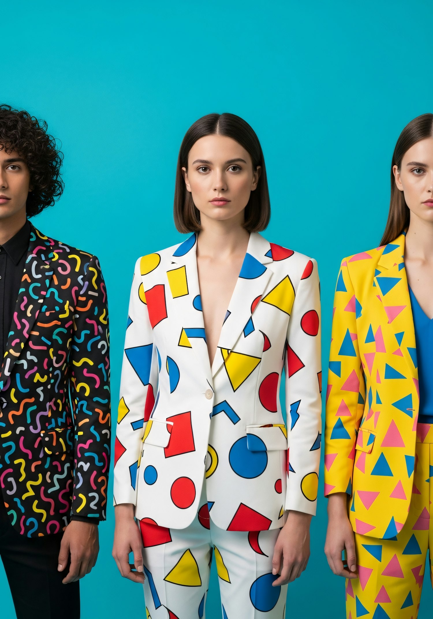 Three individuals in vibrant geometric-patterned suits stand against a turquoise background, showcasing bold and colorful fashion.