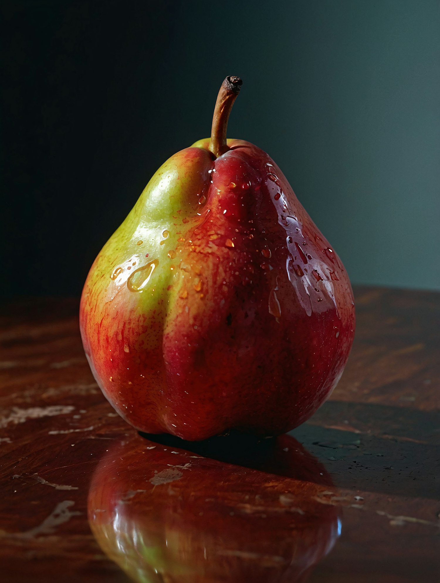 A vibrant red and green pear with water droplets on a wooden table, set against a deep green background.