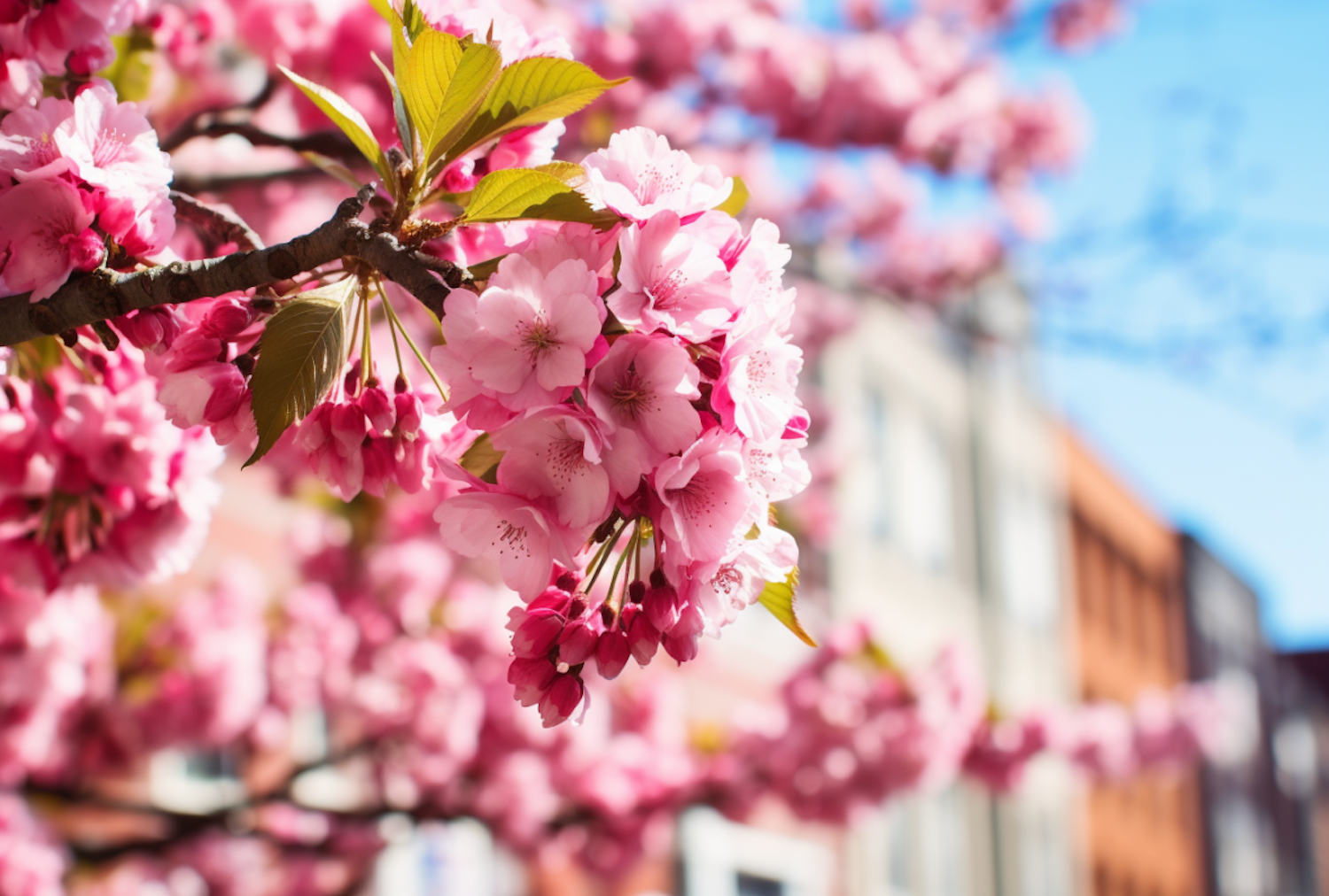 Vibrant cherry blossoms in full bloom against a clear blue sky, with urban buildings blurred in the background.